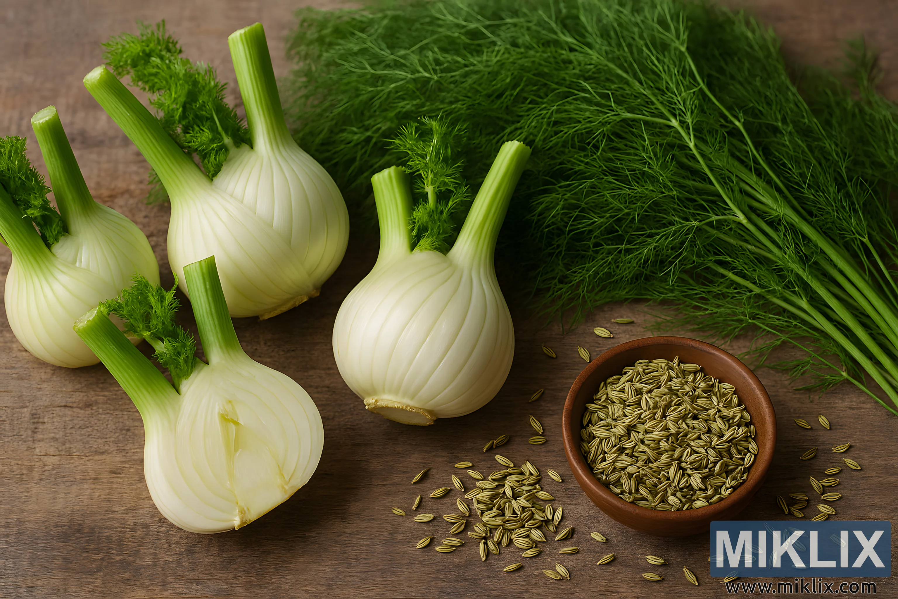 High-resolution image of harvested fennel parts including bulbs, fronds, and seeds, styled for culinary use on a rustic wooden background.