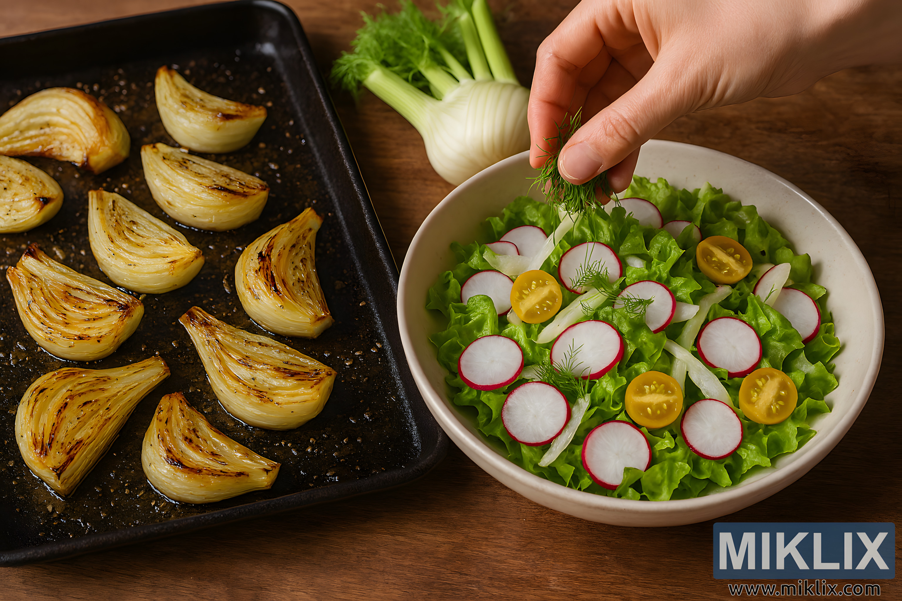 A vibrant kitchen scene showing fennel bulbs roasted to golden perfection and fresh fronds sprinkled onto a colorful salad.