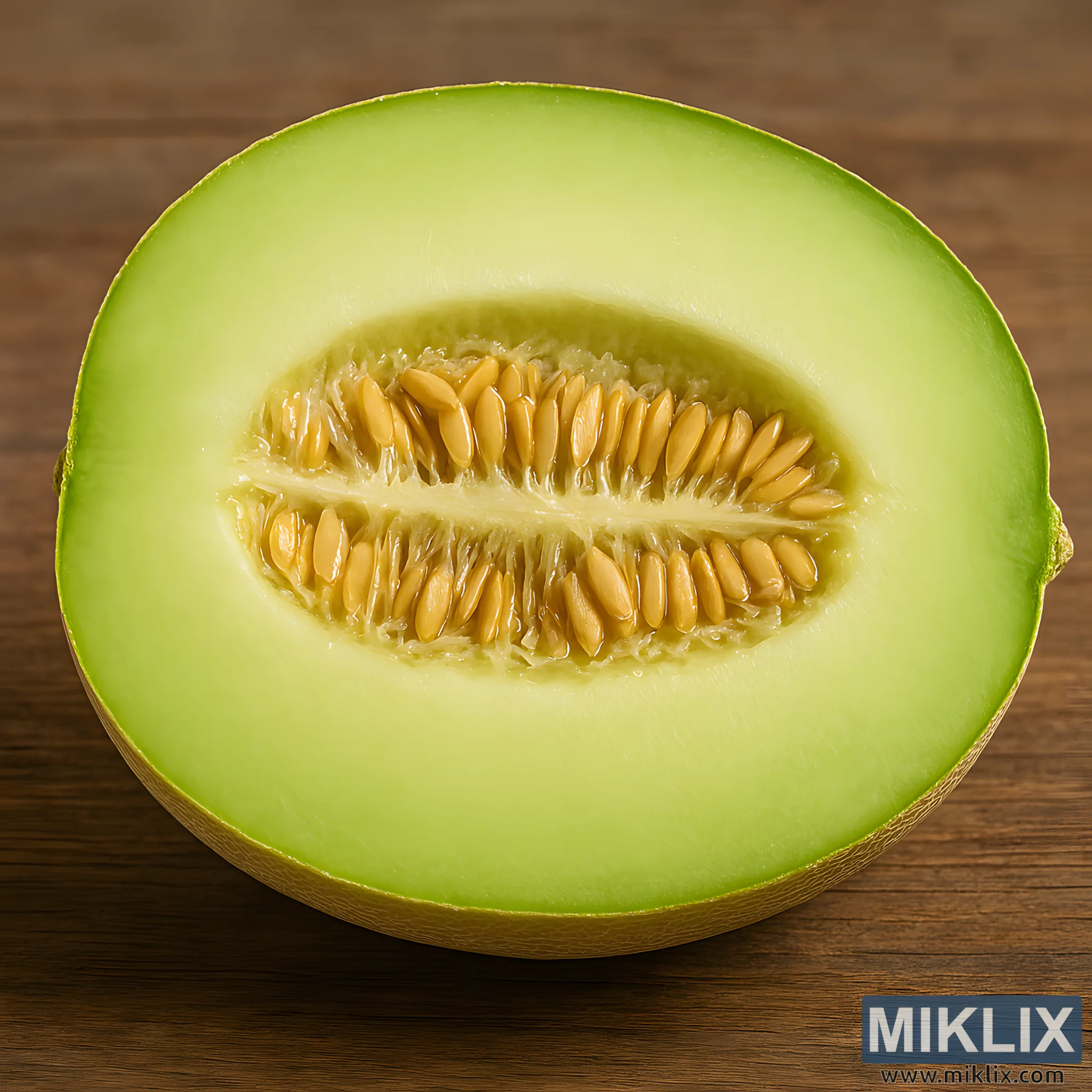 High-resolution image of a ripe honeydew melon halved to reveal its pale green flesh and seed cavity, set on a warm wooden surface.