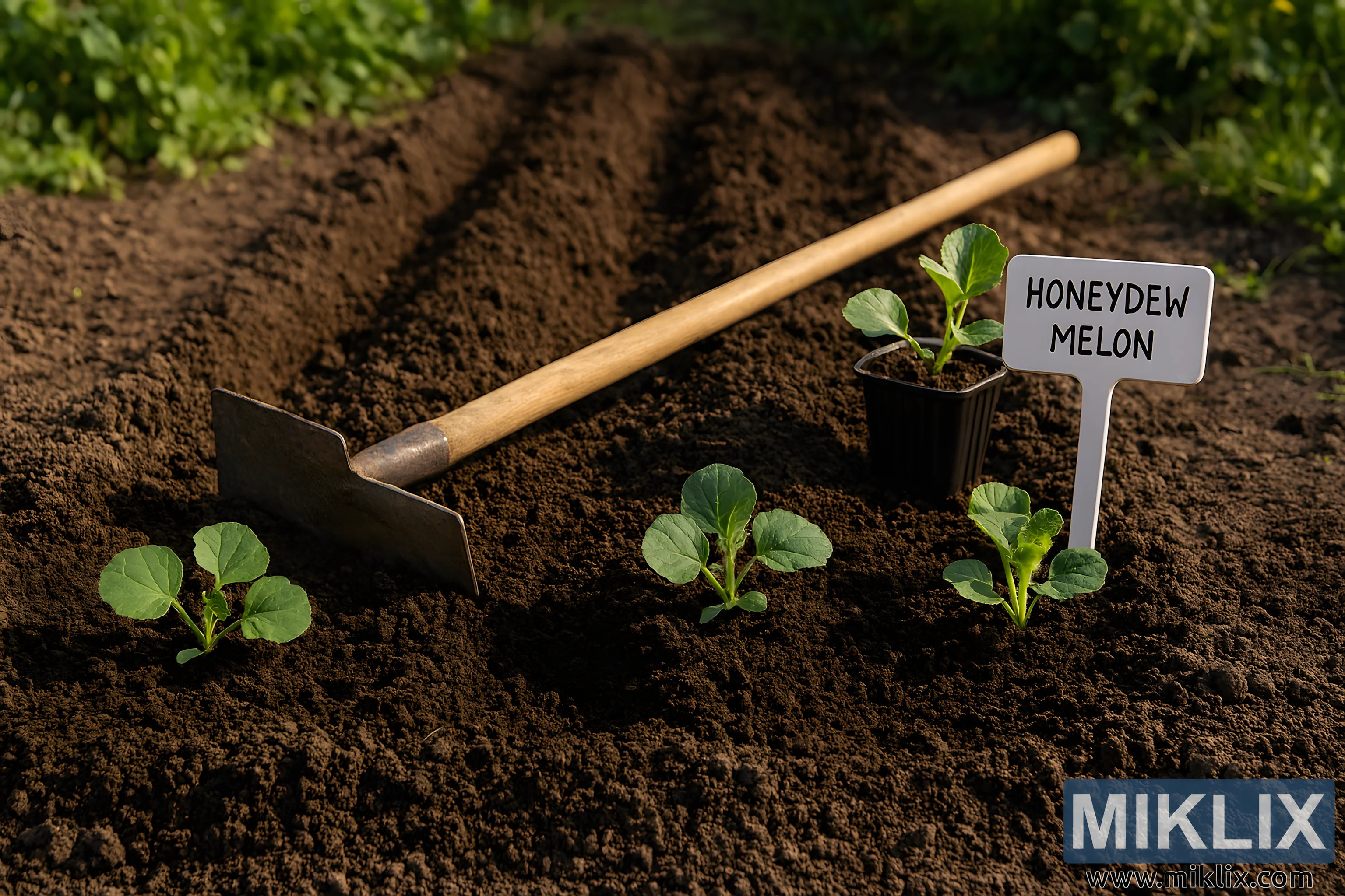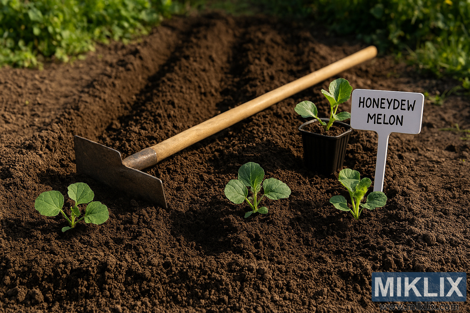 High-resolution image of a garden bed being prepared for planting honeydew melon, featuring seedlings, tools, and rich soil in natural light