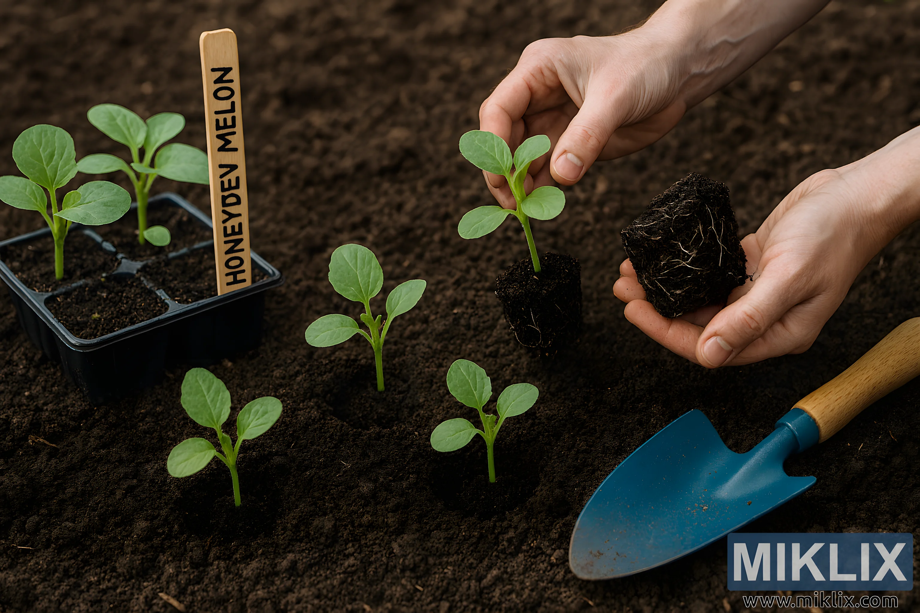 A close-up view of honeydew melon seedlings being transplanted into rich garden soil, featuring a gardener's hands, labeled tray, and blue trowel.