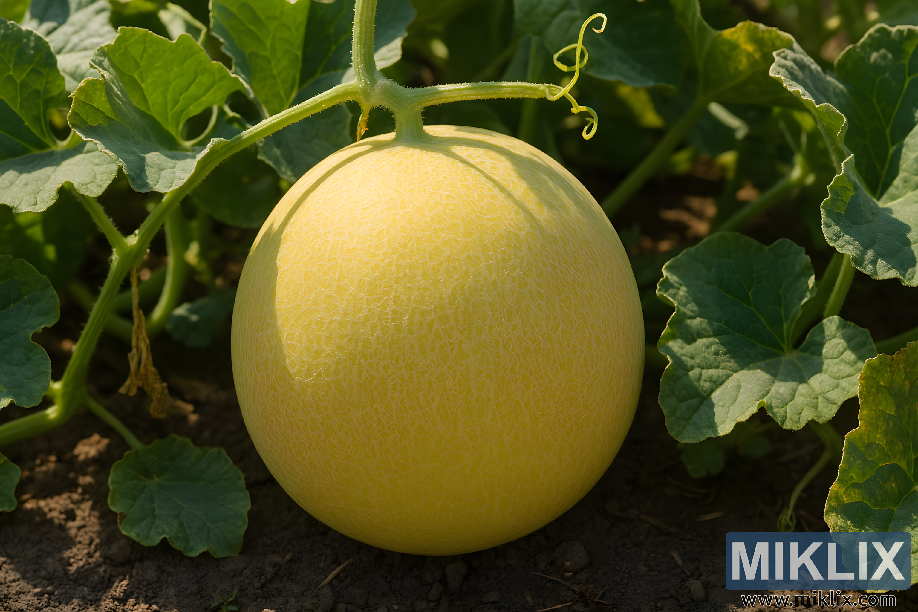 High-resolution landscape photo of a ripe honeydew melon still attached to the vine in a sunlit garden, with detailed leaves, tendrils, and rich soil textures, perfect for culinary, gardening, and educational use.