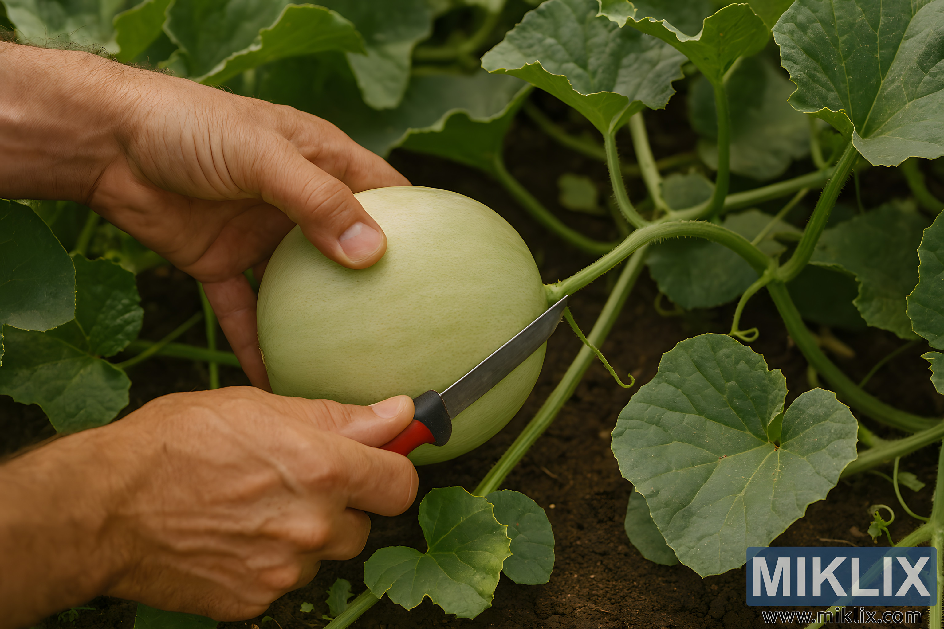 Close-up image of proper honeydew melon harvesting technique, showing hands, pruning shears, and ripe fruit in garden setting.