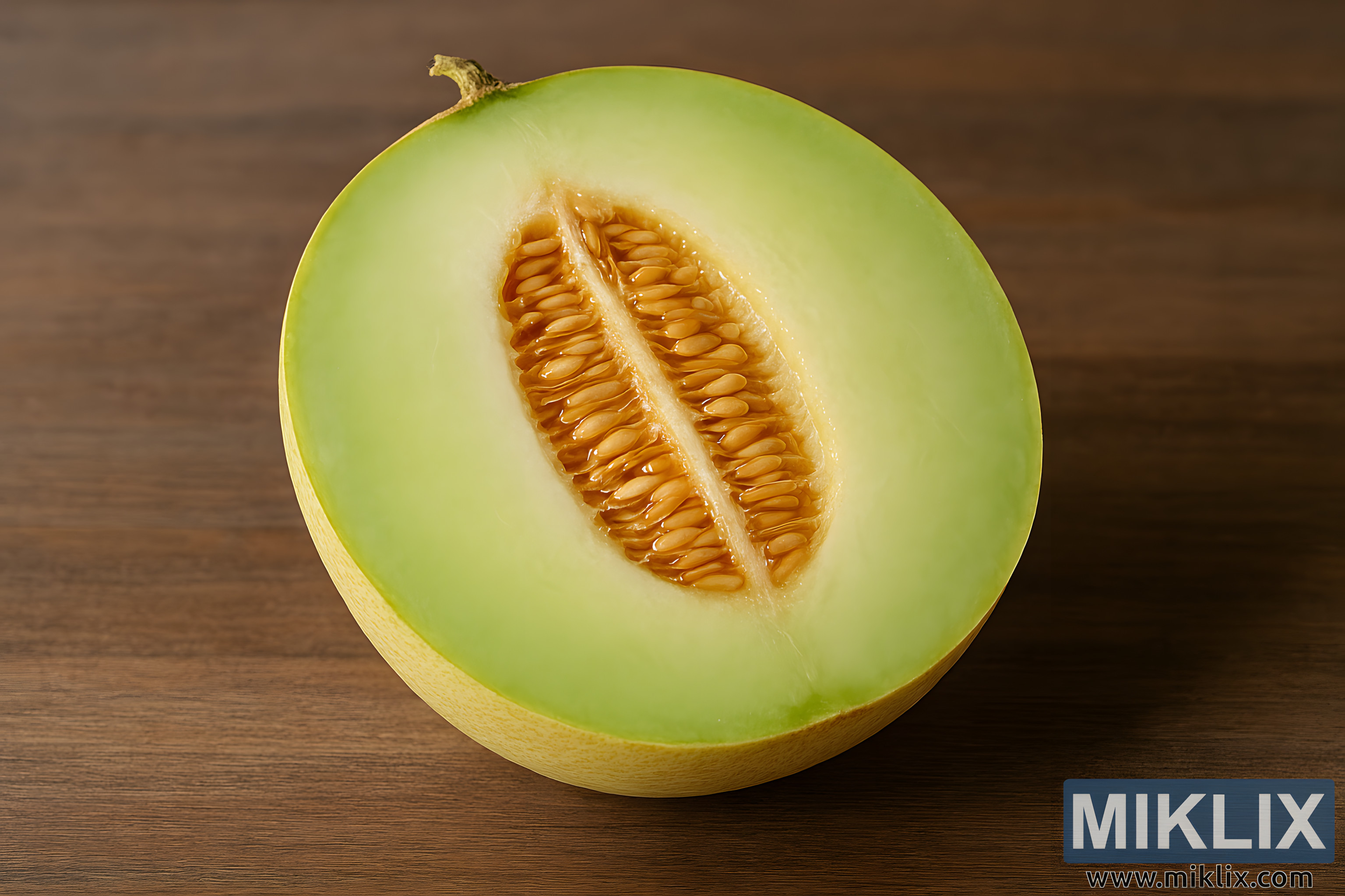 High-resolution image of a ripe honeydew melon cut in half, revealing pale green flesh and golden-brown seeds, placed on a warm wooden surface.
