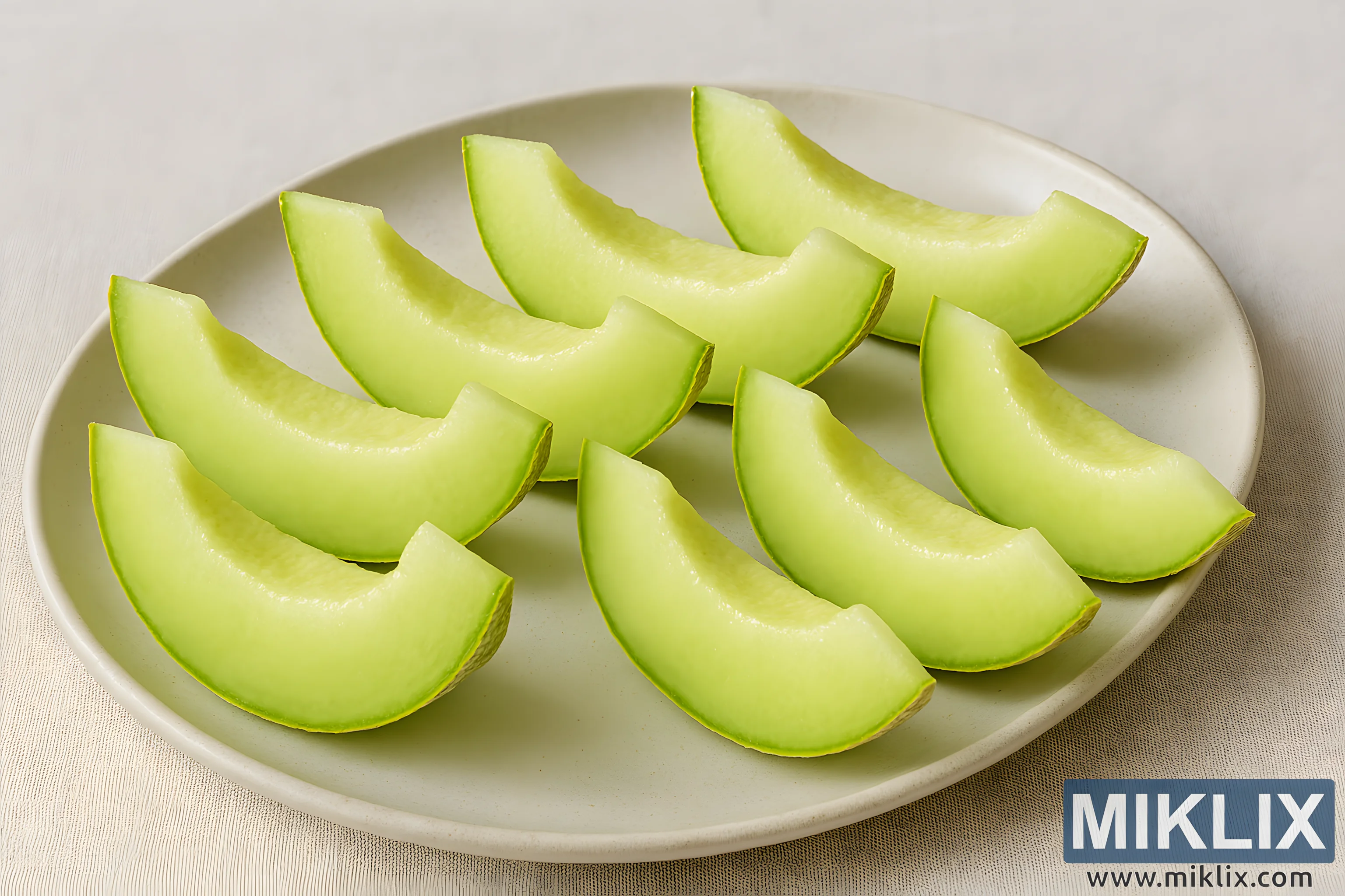 The overall color scheme is harmonious and soothing, dominated by shades of green and off-white. The vibrant green of the honeydew contrasts delicately with the neutral tones of the platter and tablecloth, drawing the viewer’s eye to the fruit as the focal point. The composition is clean and uncluttered, with ample negative space that enhances the visual impact of the melon slices.