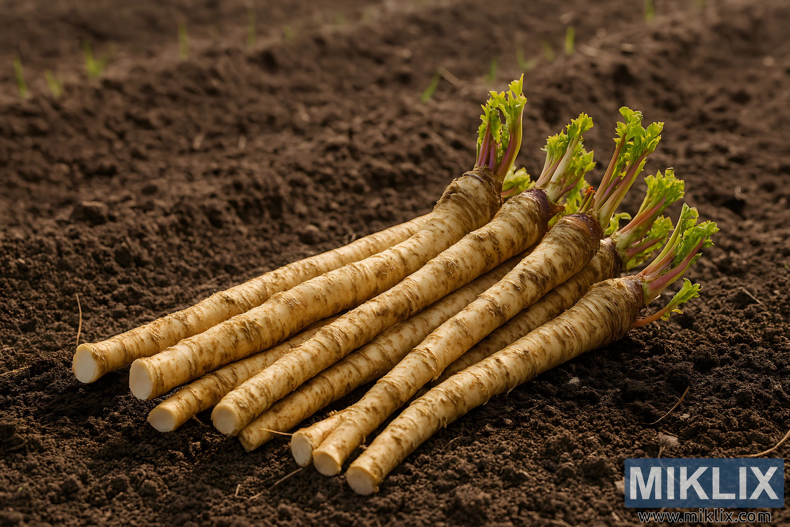 High-resolution image of freshly harvested horseradish roots ready for planting in early spring, showcasing earthy textures and vibrant sprouts.