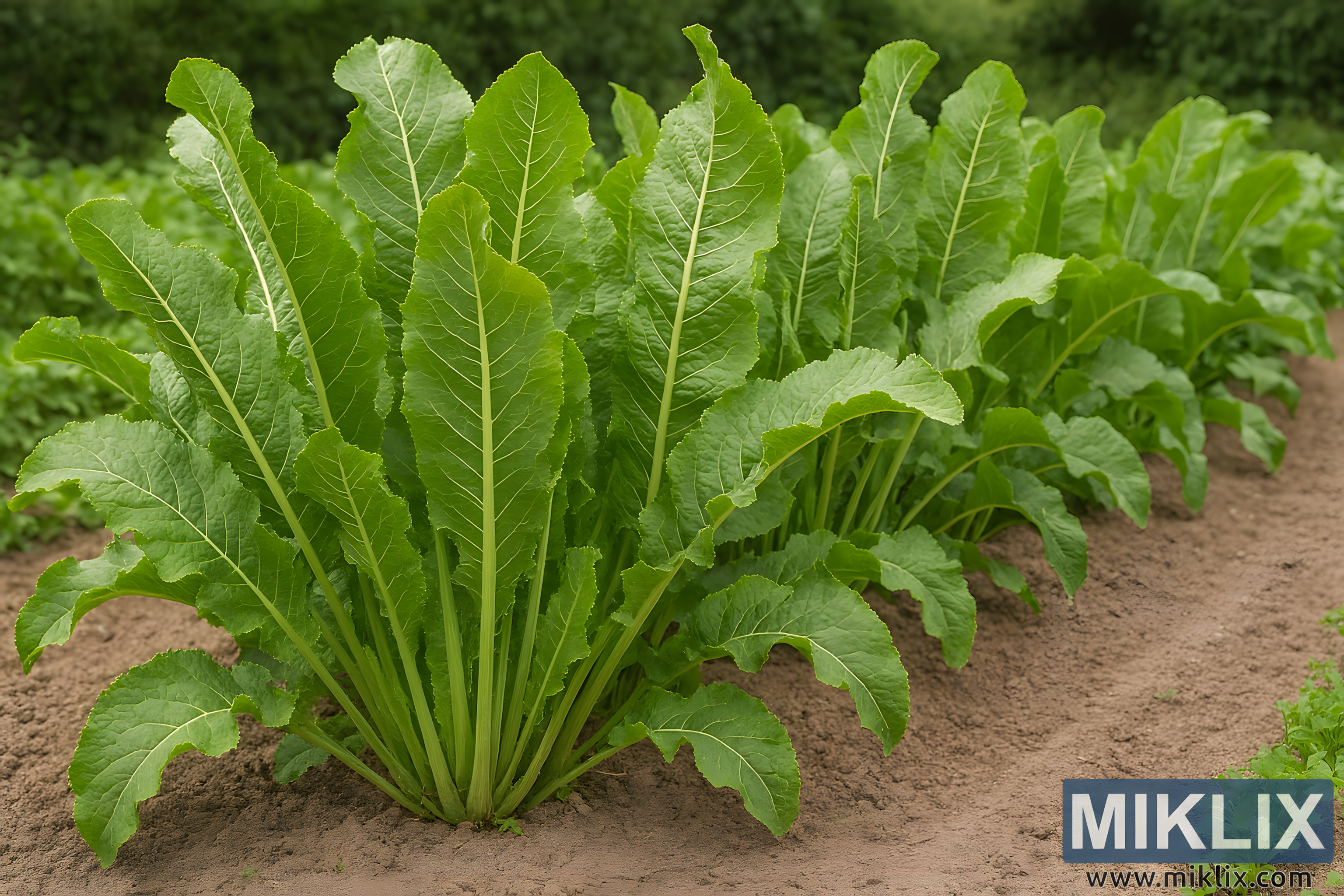 This image is ideal for educational, agricultural, culinary, or botanical contexts, offering a detailed and realistic portrayal of horseradish cultivation in a temperate outdoor setting.