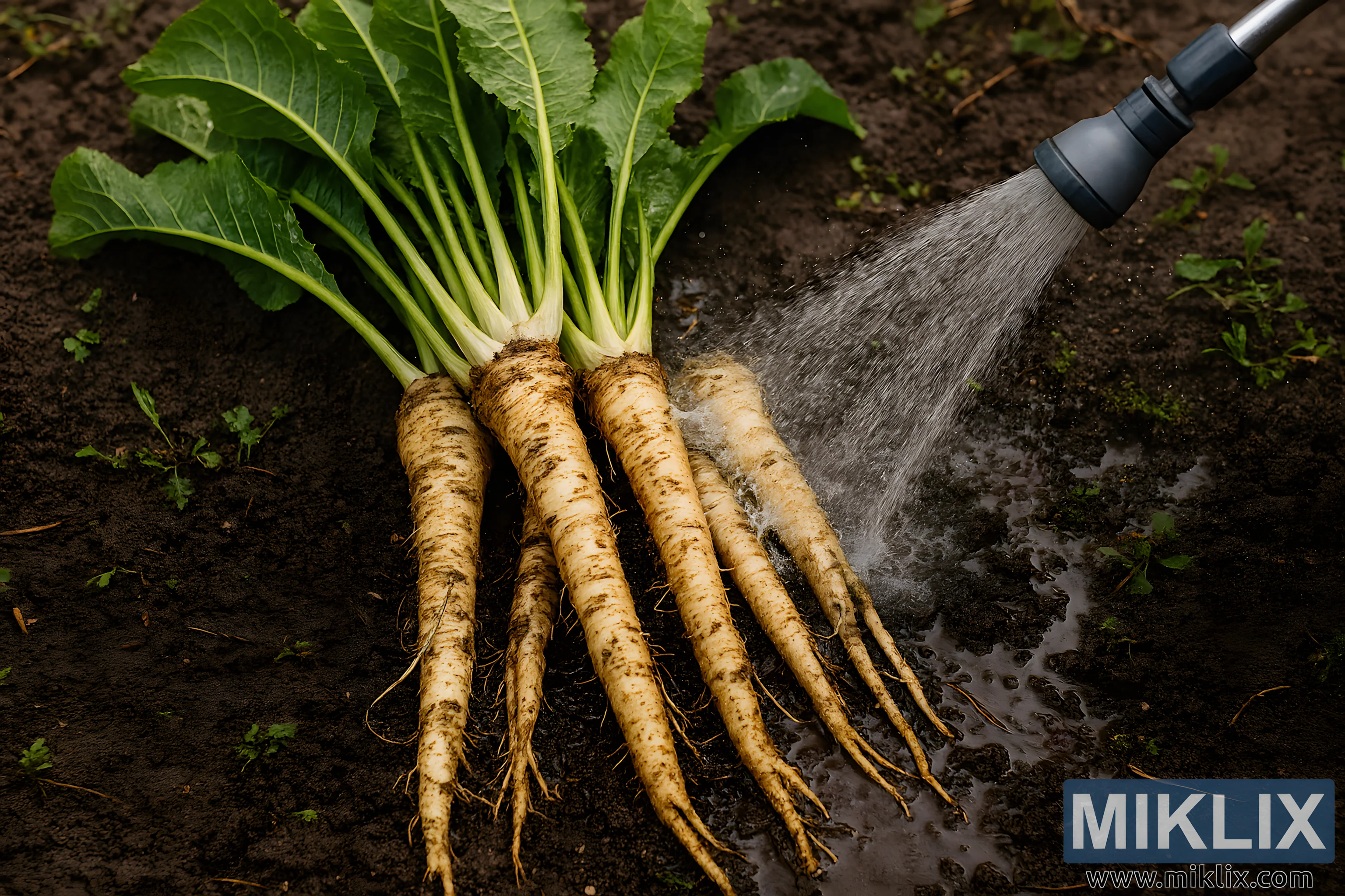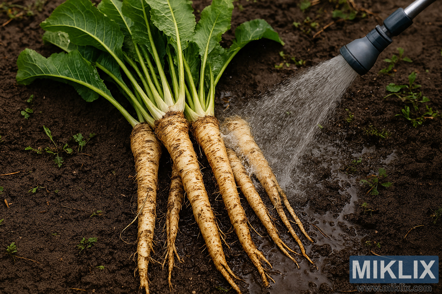 High-resolution image of freshly harvested horseradish roots being washed with a garden hose after fall harvest, showcasing root texture, soil, and vibrant green tops.