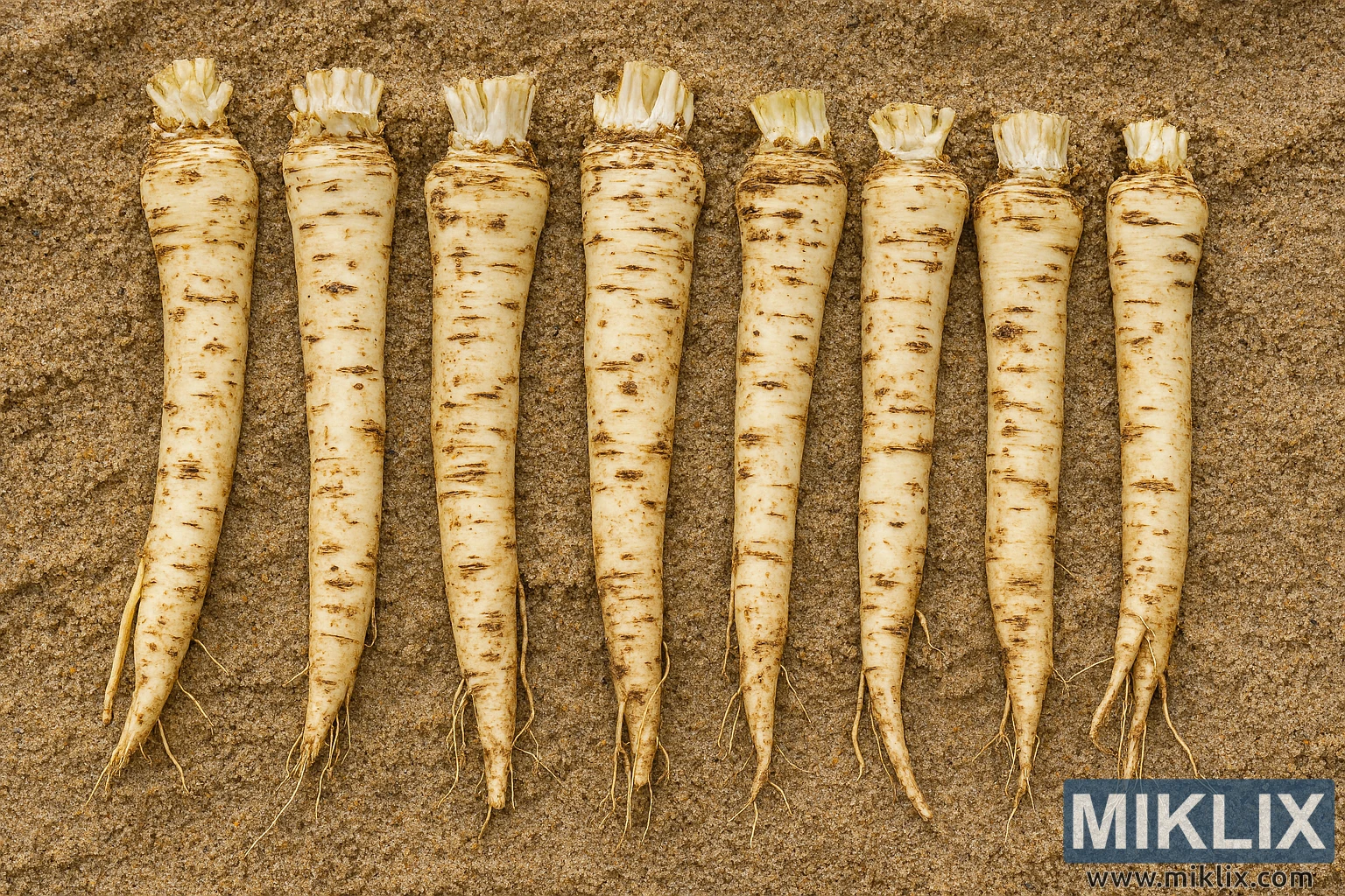 Nine horseradish roots are laid out horizontally in parallel rows, partially buried in the sand with their tops exposed. Each root is thick and cylindrical, tapering slightly toward the lower end, and measures approximately 20–30 cm in length. Their surfaces are pale tan with irregular dark brown streaks, spots, and ridges, giving them a rugged, earthy appearance. Fine horizontal growth rings encircle the roots at uneven intervals, and small fibrous remnants of stems protrude from the tops, some with hints of pale green buds or leaf stubs.