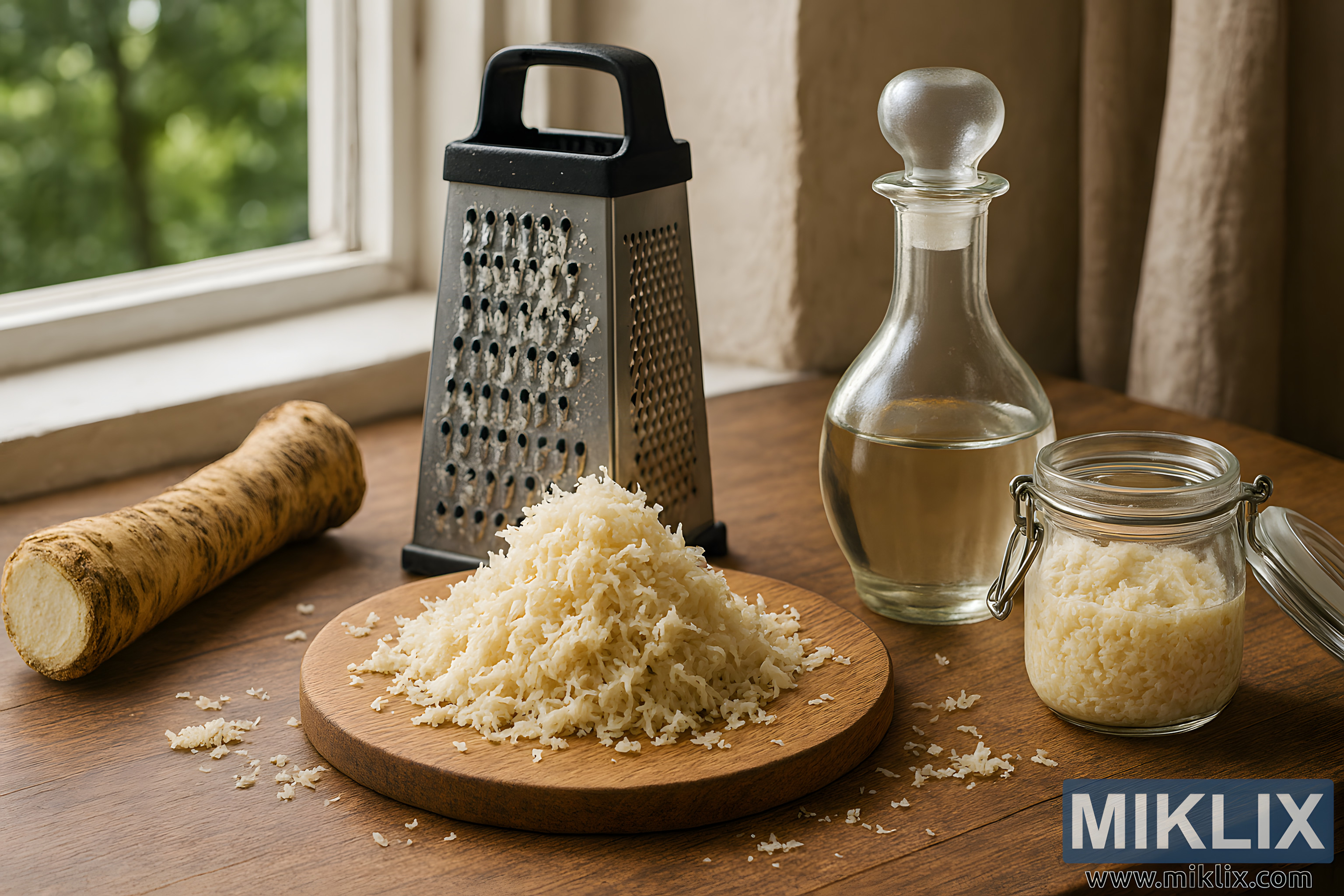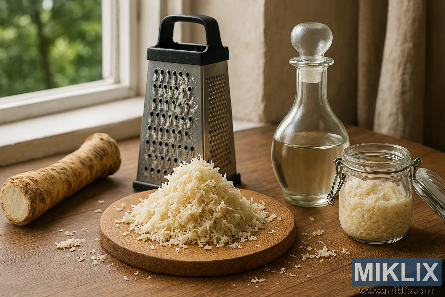 A rustic kitchen scene showing freshly grated horseradish being prepared with vinegar near an open window.