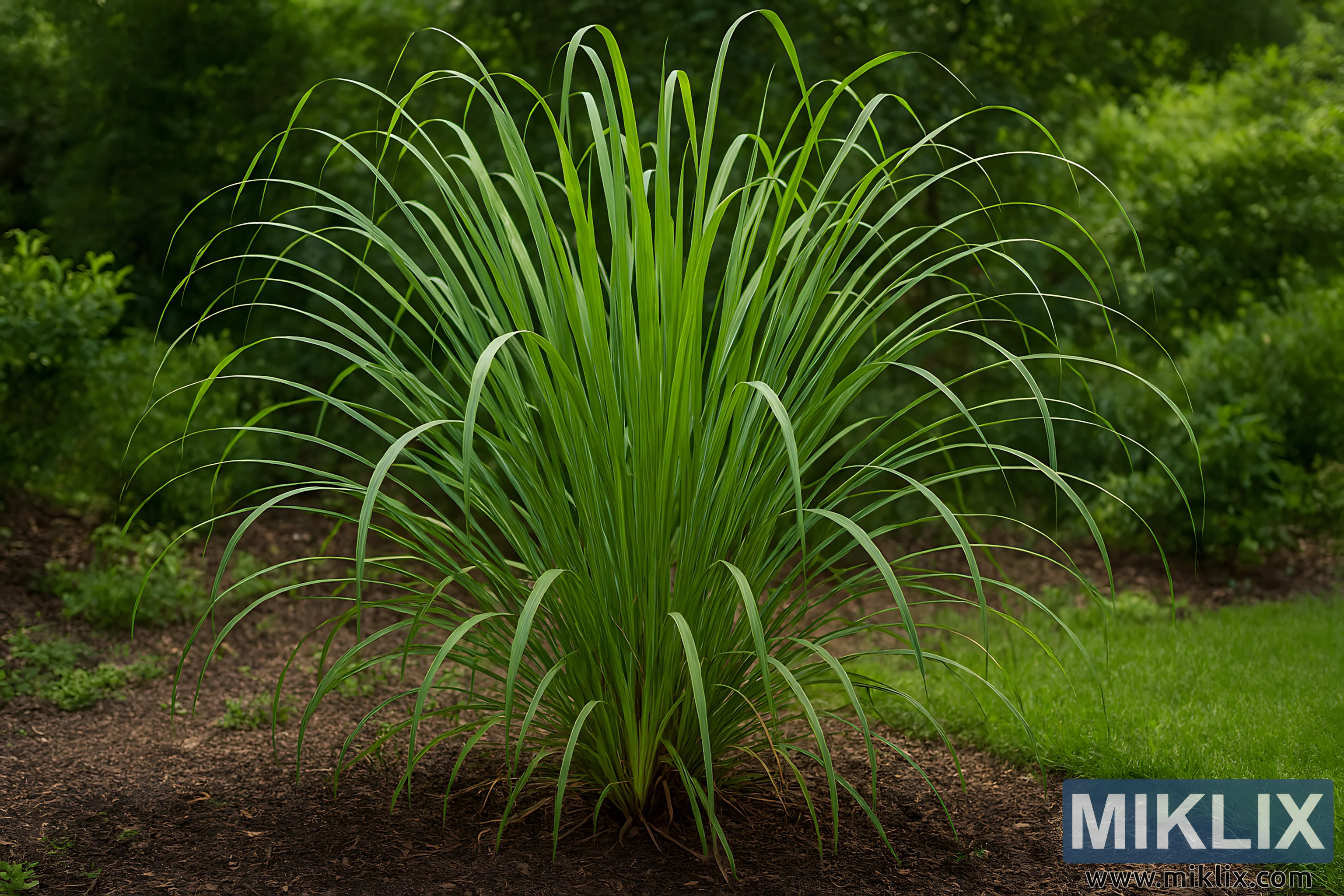 Overall, the image conveys a sense of botanical vitality and serene garden ambiance. The composition is balanced and immersive, ideal for educational, culinary, or horticultural contexts where plant identification and realism are essential. The lemongrass stands as a symbol of tropical resilience and utility, beautifully integrated into a temperate garden landscape.