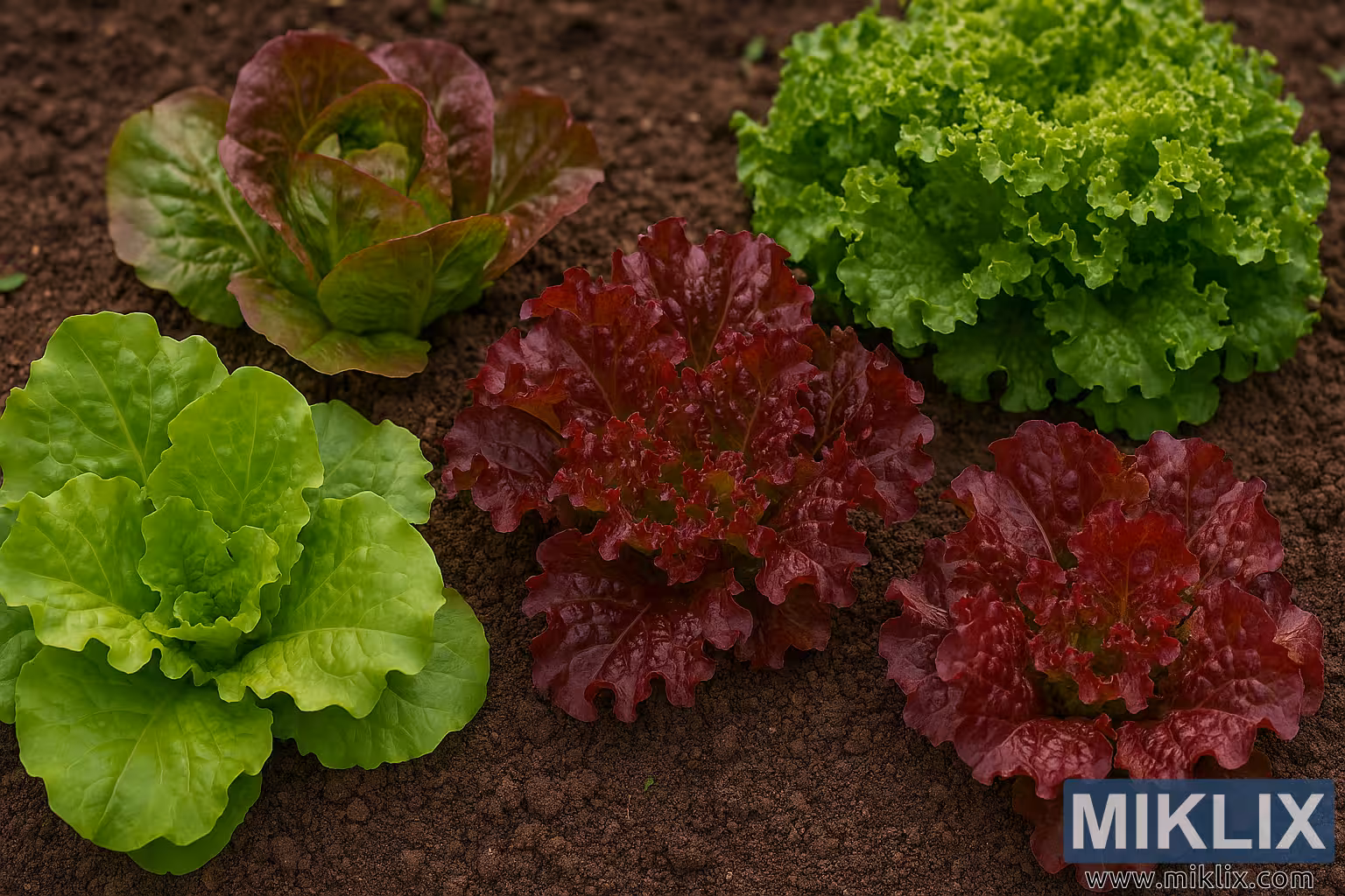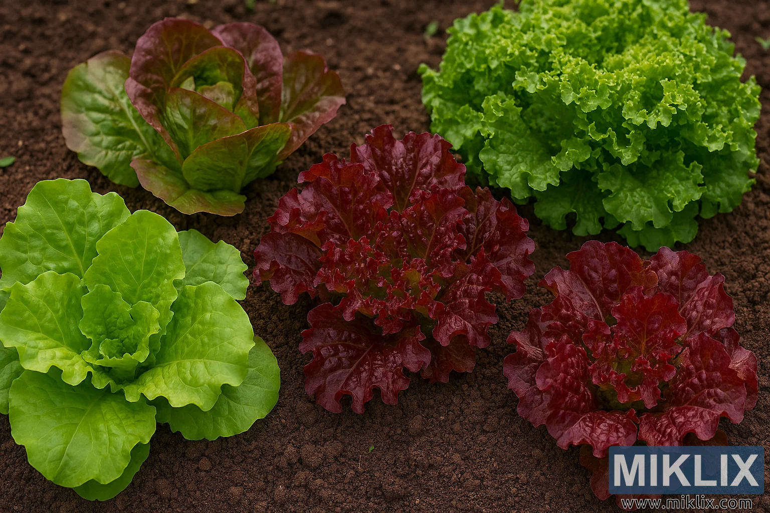 High-resolution image of diverse lettuce varieties thriving in a home garden bed with rich soil and natural lighting.