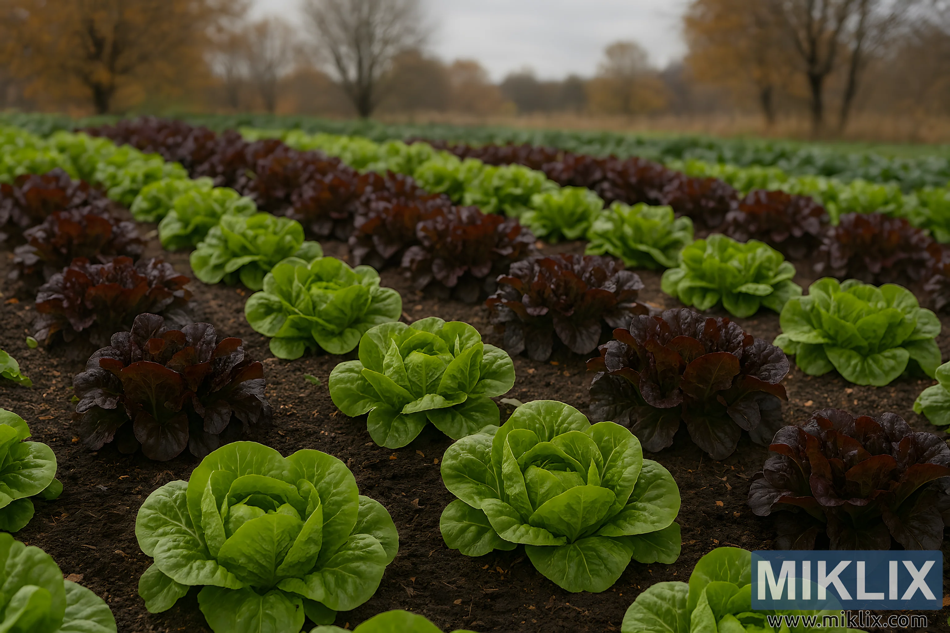 High-resolution landscape image of a fall lettuce garden featuring mature butterhead and red leaf lettuce in cool, overcast weather.