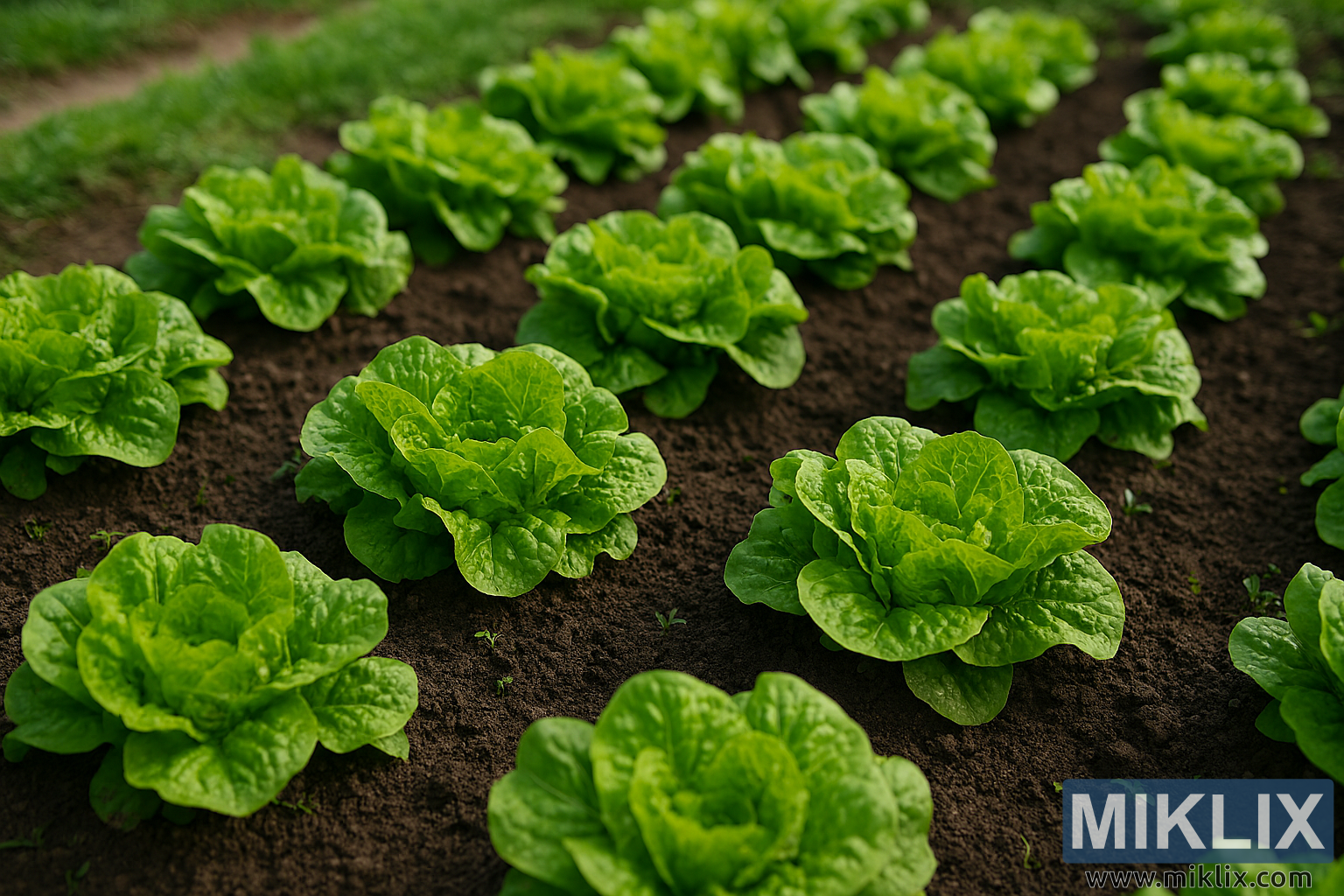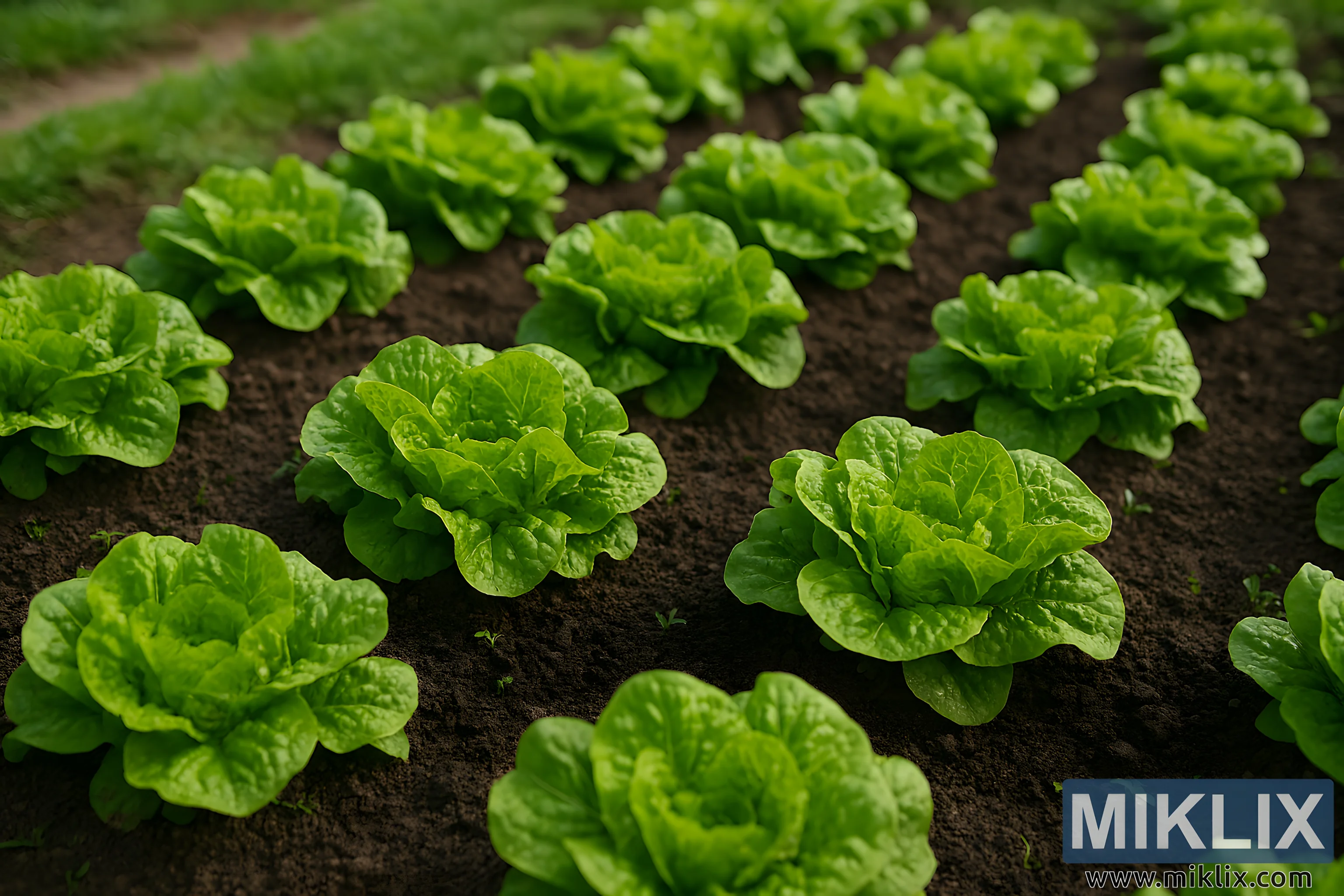 This high-resolution landscape photograph captures a serene and productive moment in a traditional garden bed, where rows of vibrant green lettuce plants thrive in rich, dark soil. The image is taken from a slightly elevated angle, allowing a clear view of the orderly planting and the lush texture of the lettuce leaves.