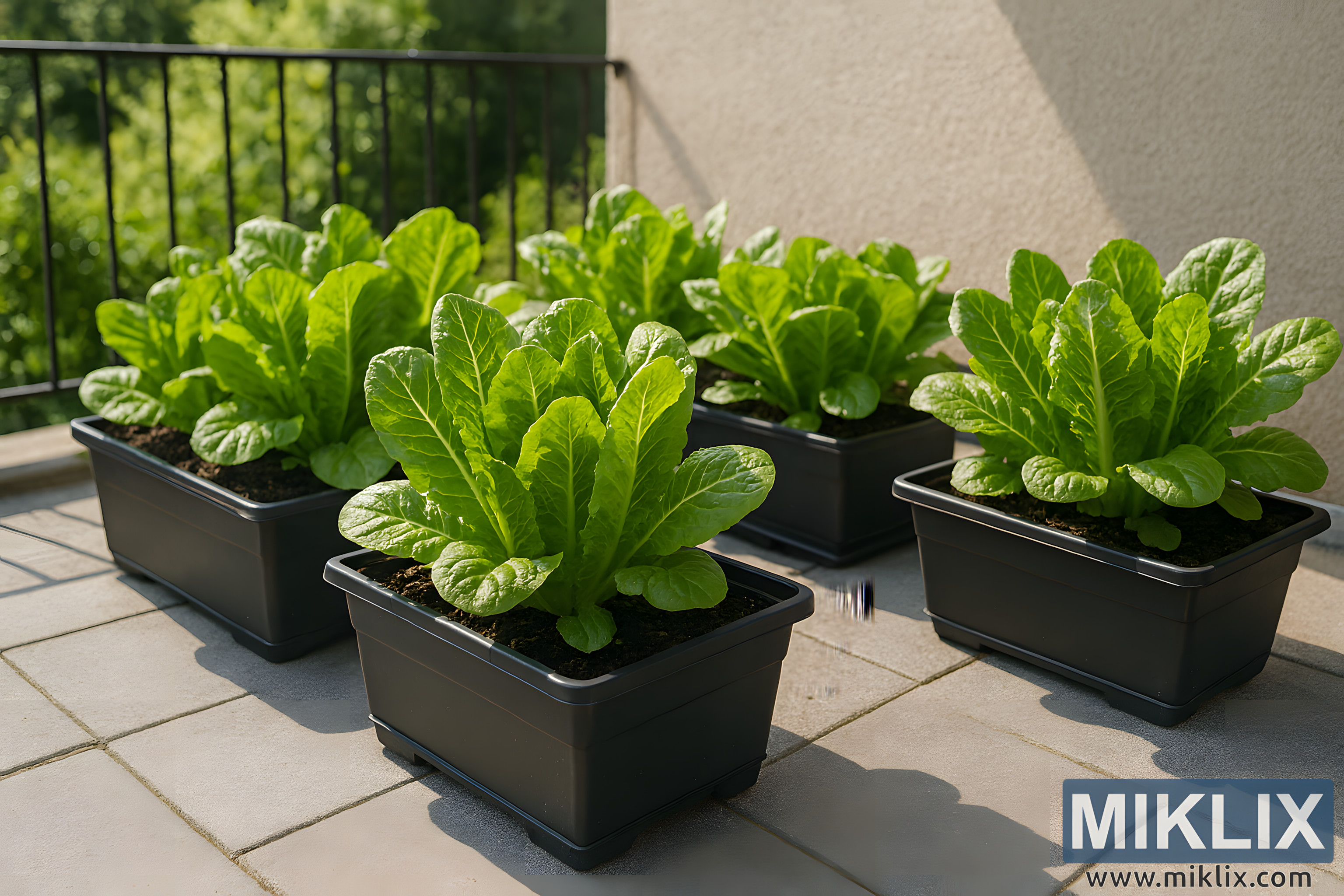High-resolution image of Romaine lettuce thriving in black containers on a sunlit patio with paving stones and garden railing.