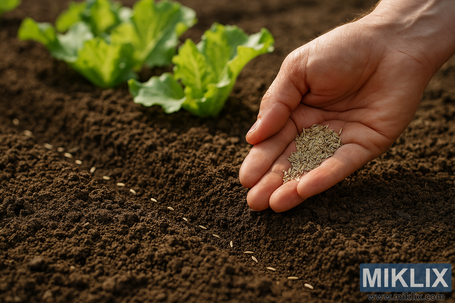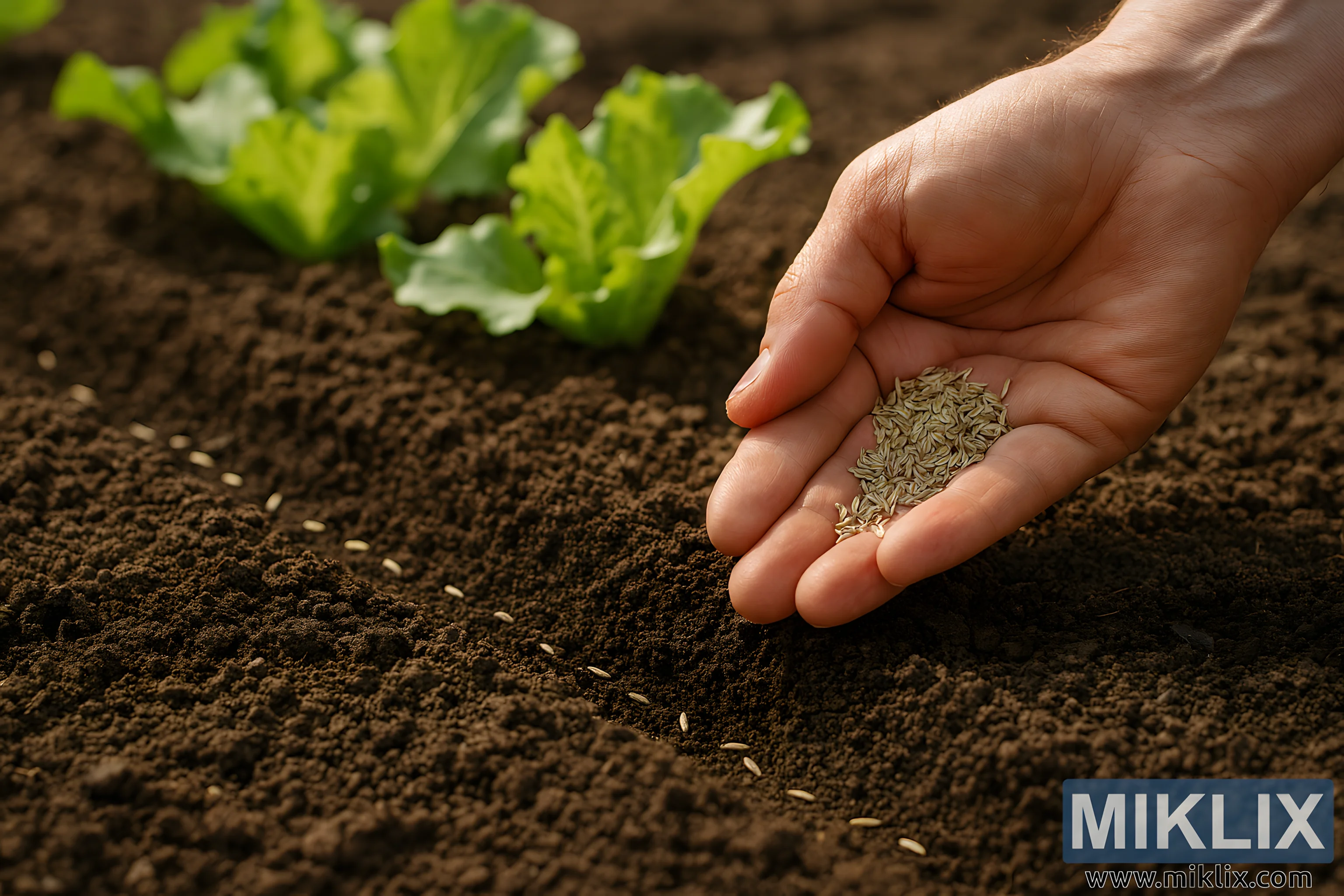 The composition is balanced and harmonious, with the hand and seeds drawing immediate attention while the lettuce plants provide context and continuity. The shallow depth of field ensures that the viewer’s focus remains on the act of sowing, while the blurred background adds a sense of space and tranquility.