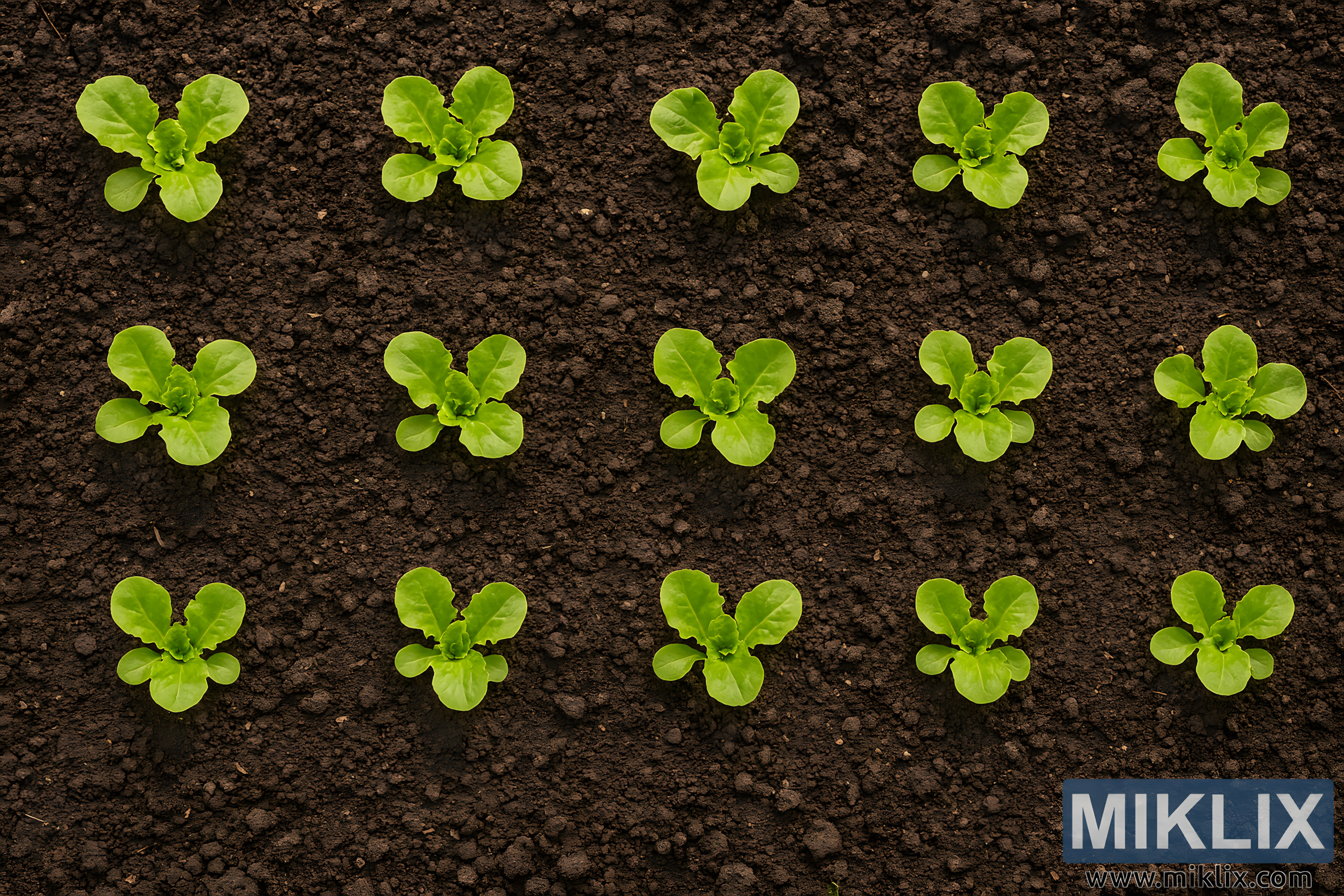 High-resolution landscape photo showing healthy, evenly spaced lettuce seedlings in rich soil after thinning, ideal for gardening education and crop spacing reference.