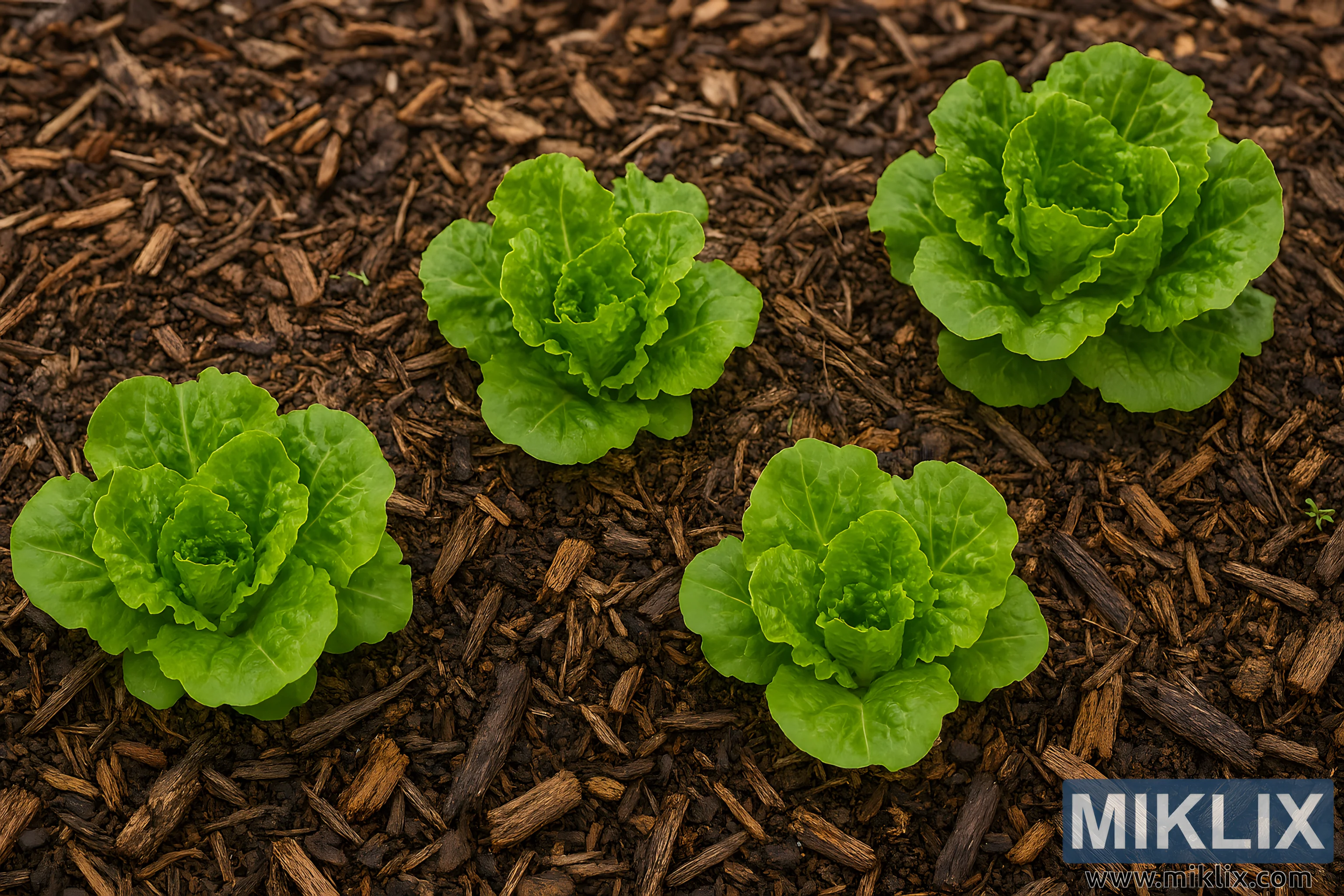 High-resolution landscape photo of lettuce plants surrounded by organic mulch, showcasing healthy growth in a natural garden setting.