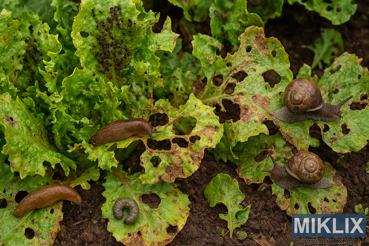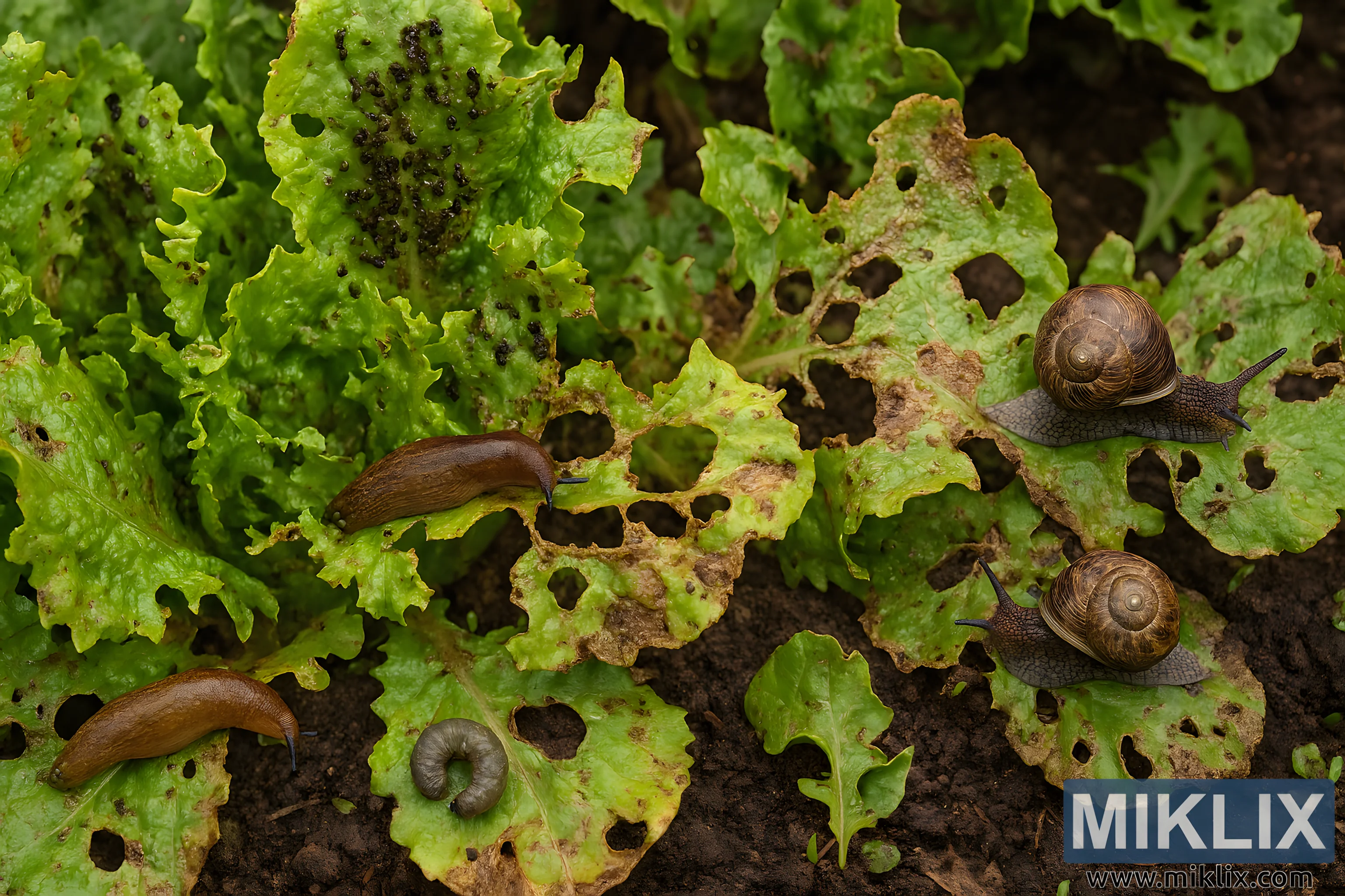High-resolution image showing lettuce plants infested by aphids, slugs, snails, and cutworms, with visible bite damage from rabbits and deer.