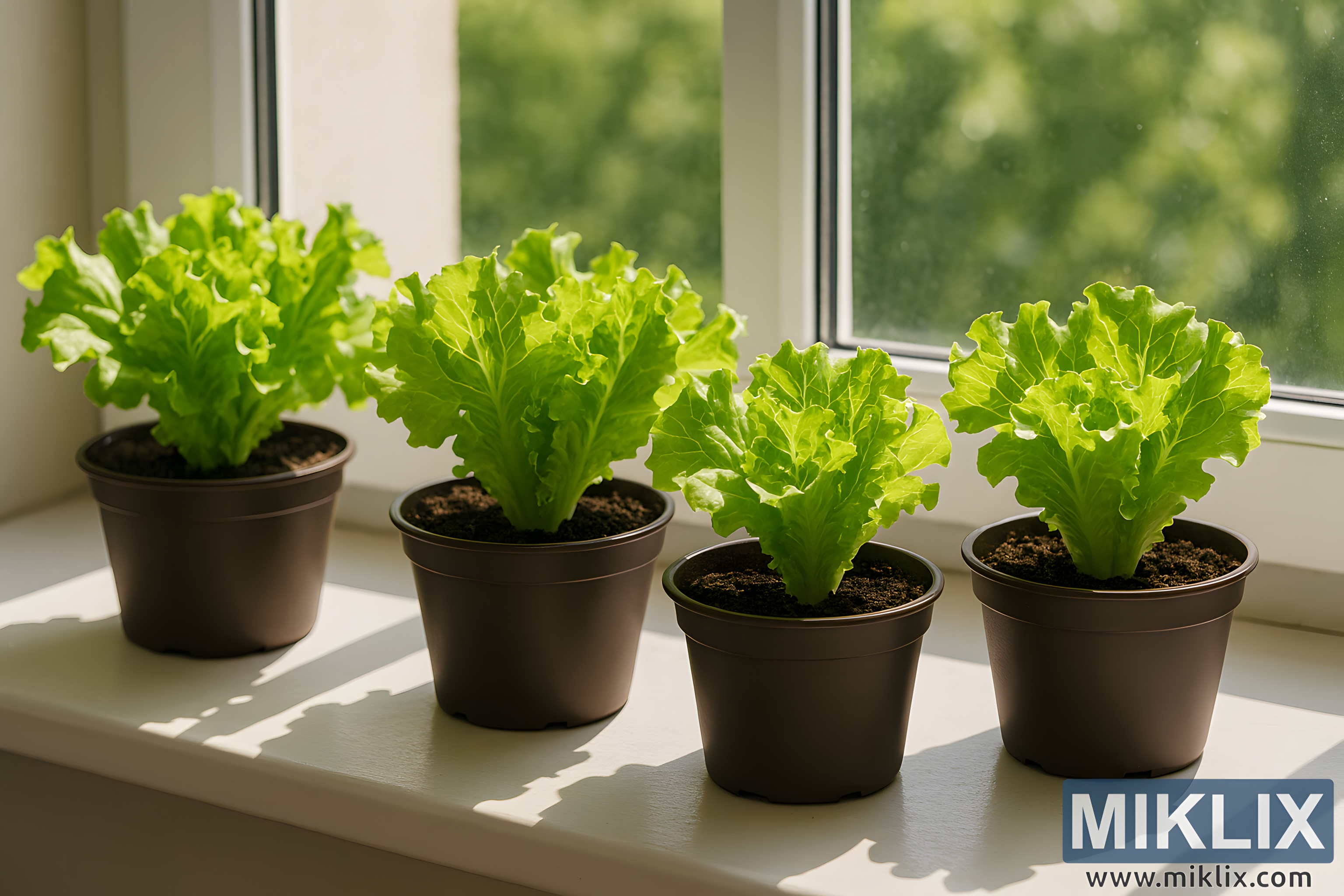 Vibrant green lettuce plants thrive in pots on a bright windowsill, bathed in natural sunlight.