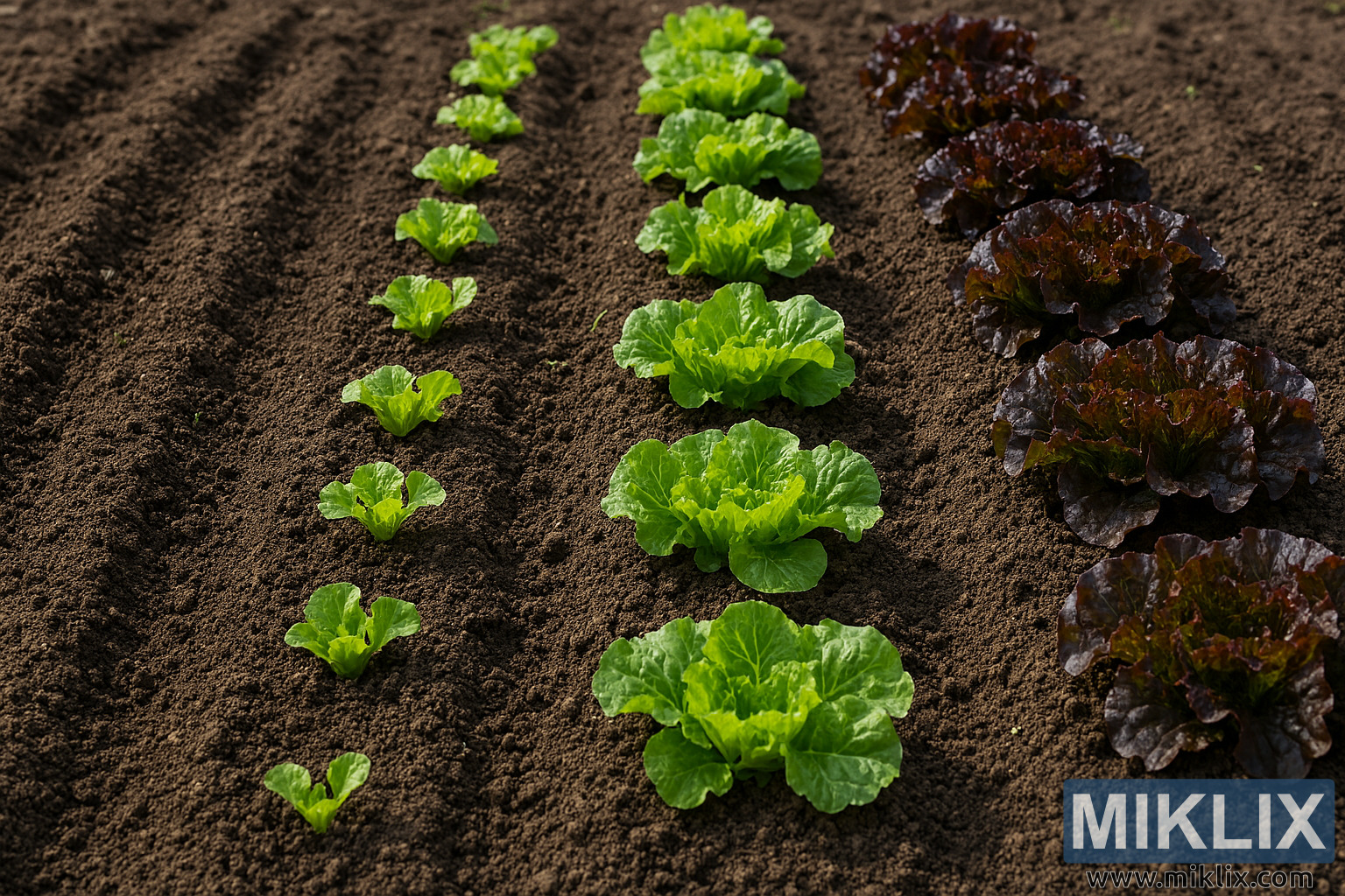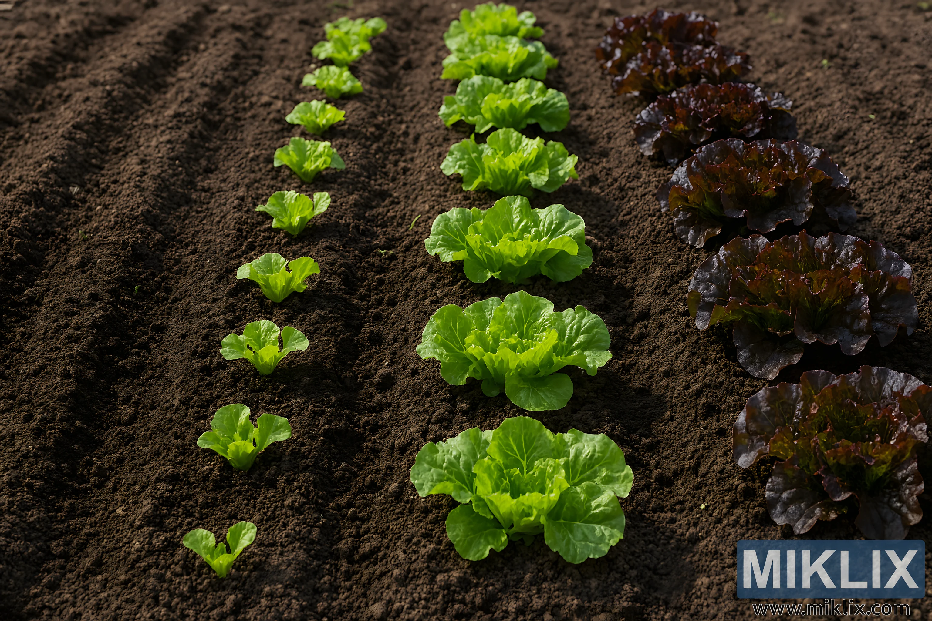 High-resolution landscape image showing succession planting of lettuce with distinct growth stages from seedlings to mature red-leaf heads.