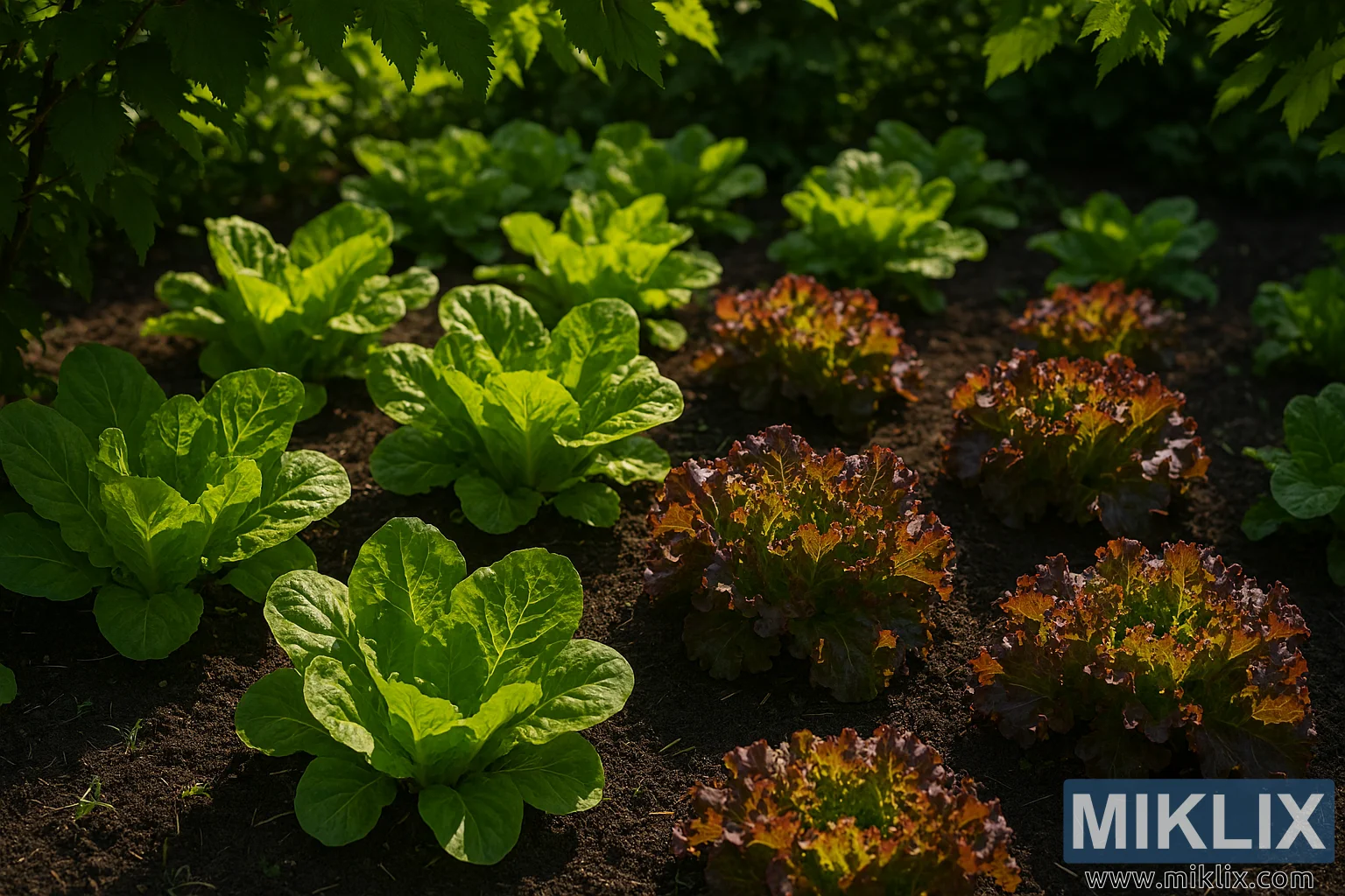 This high-resolution landscape photograph captures a thriving summer garden bed filled with heat-tolerant lettuce varieties flourishing under partial shade. The composition is rich with horticultural detail, showcasing rows of lush green and reddish-purple lettuce plants growing in dark, fertile soil.