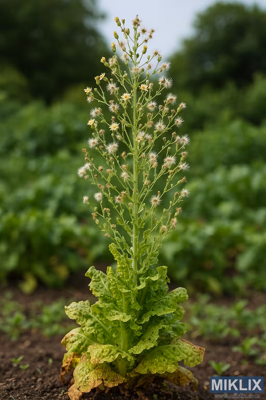 High-resolution image of a lettuce plant that has bolted, showing its flowering stalk and seed production in a lush garden environment.