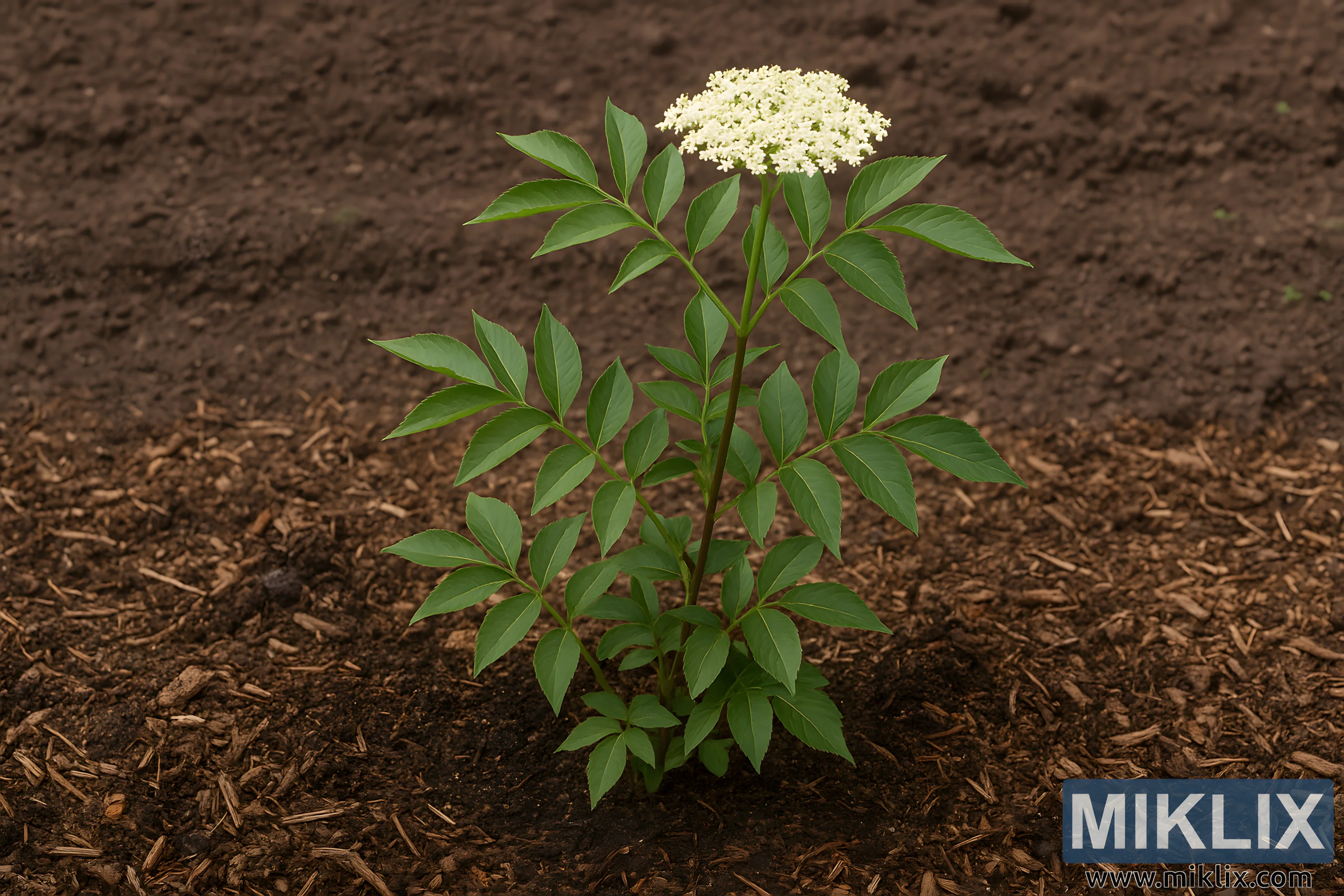 A close-up photo of an elderberry plant thriving in a well-prepared garden bed with organic mulch, showing vibrant leaves and small white flowers.