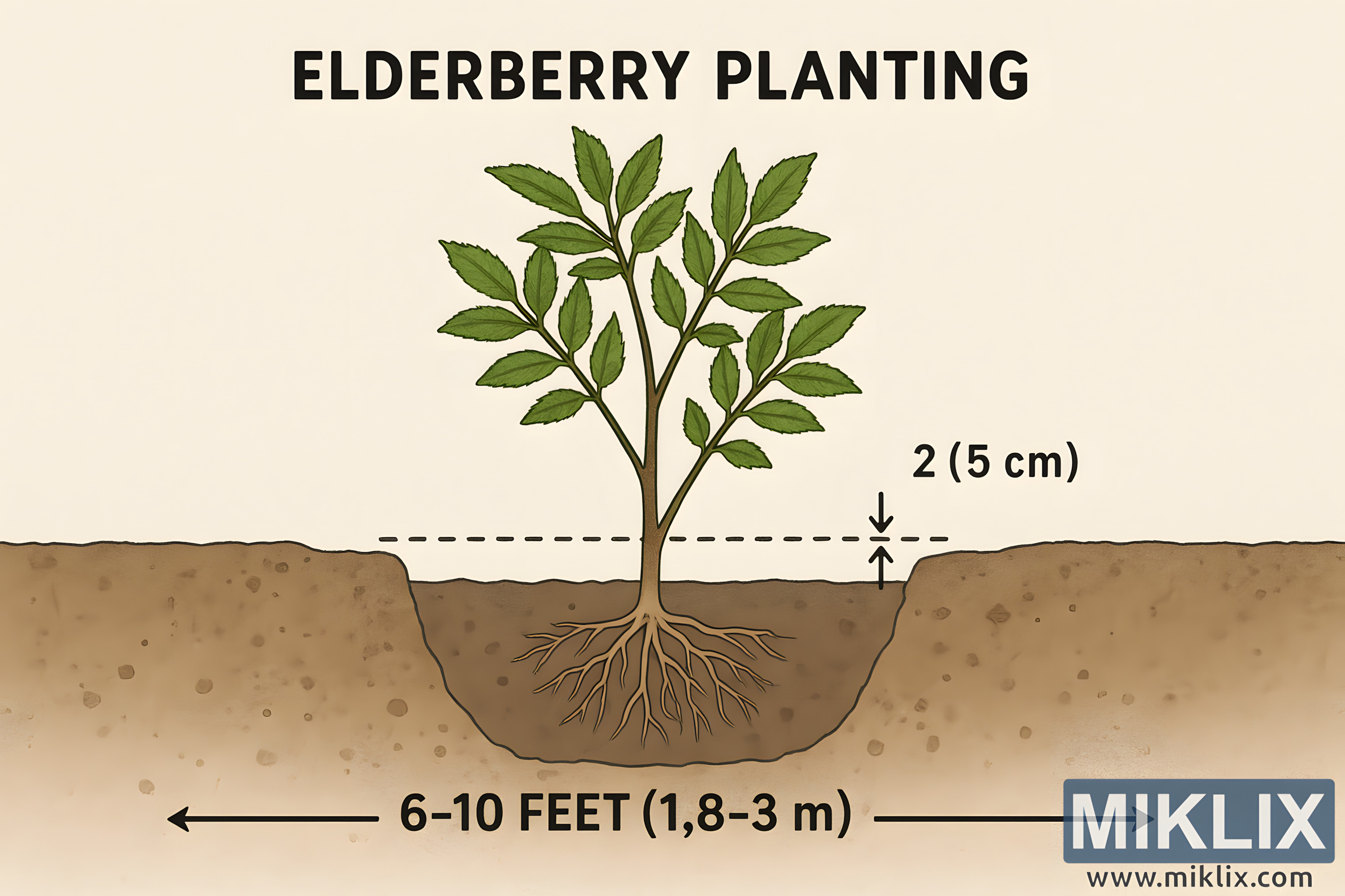 Learn how to plant elderberries correctly with this detailed diagram showing ideal spacing of 6–10 feet (1.8–3 m) and planting depth of 2 inches (5 cm) below soil level.