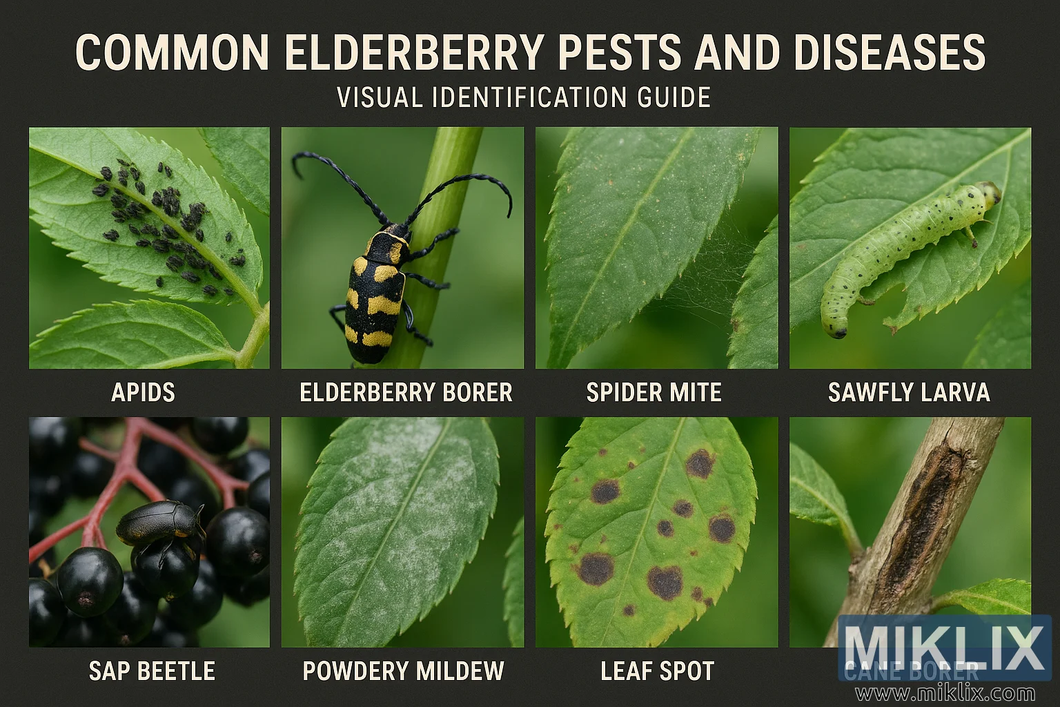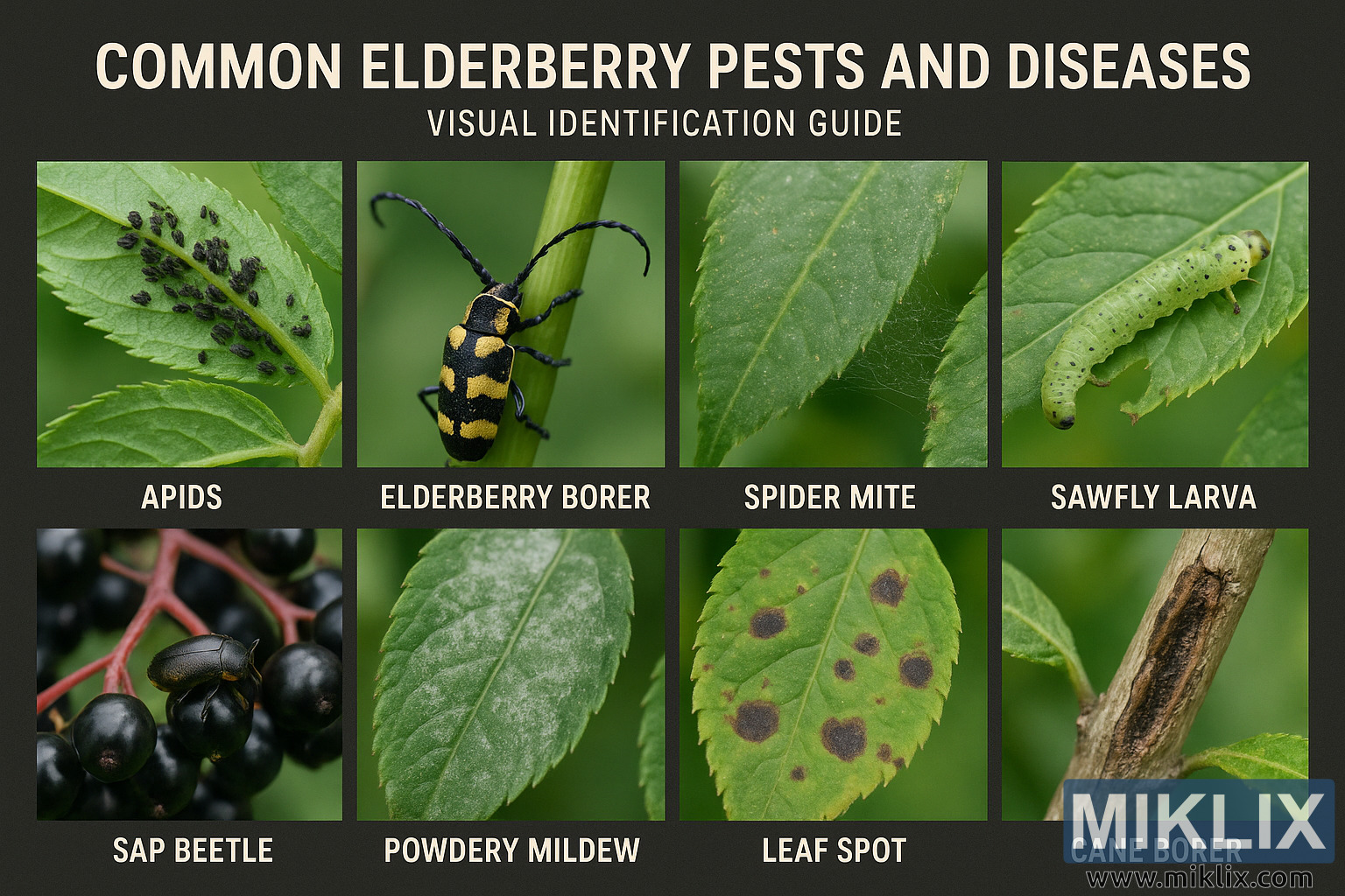 A high-resolution visual guide to common elderberry pests and diseases, featuring clear images and labels for easy identification of aphids, borers, mites, larvae, beetles, and fungal issues affecting elderberries.