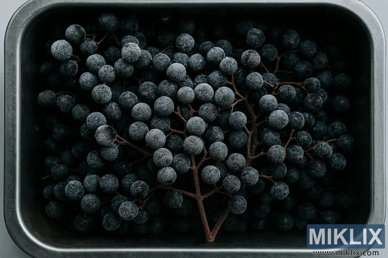 This image evokes a sense of quiet preservation and natural beauty. It could easily be used in contexts related to food photography, seasonal themes, or botanical studies. The frozen elderberries suggest a moment captured in time—nature held in suspension, waiting to be transformed into syrup, jam, or tincture. The composition is both simple and rich, inviting viewers to linger over the details and appreciate the interplay of color, texture, and form.