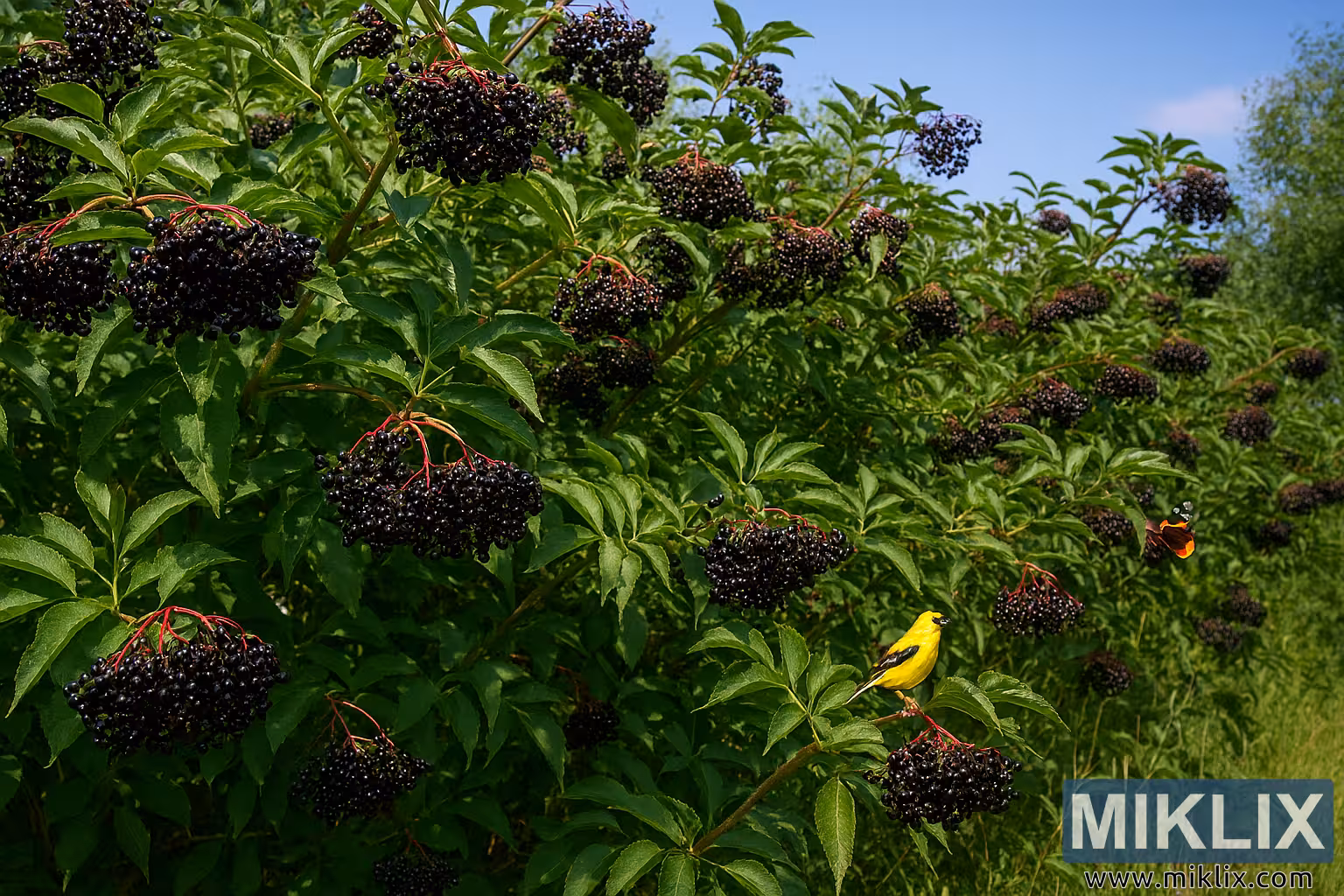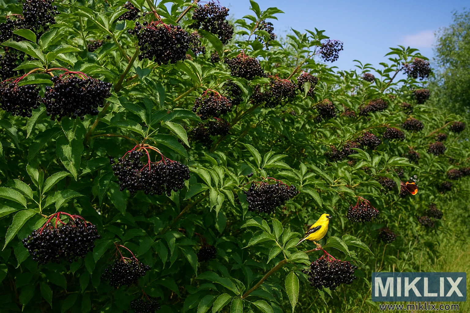 Explore a vibrant elderberry garden in full summer bloom, featuring ripe berries, lush greenery, and beneficial wildlife like goldfinches and butterflies.