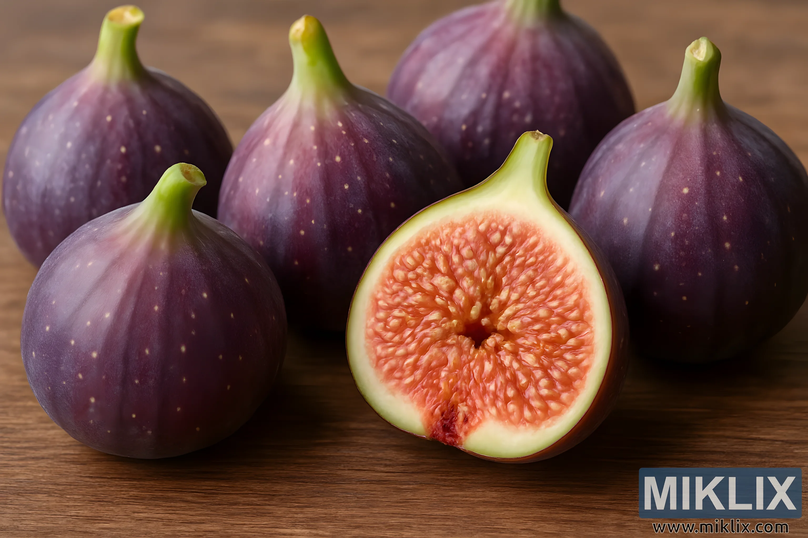A detailed, high-resolution photograph of ripe Celeste figs, showcasing their smooth purple skins and the rich red interior of a halved fig resting on a rustic wooden surface.