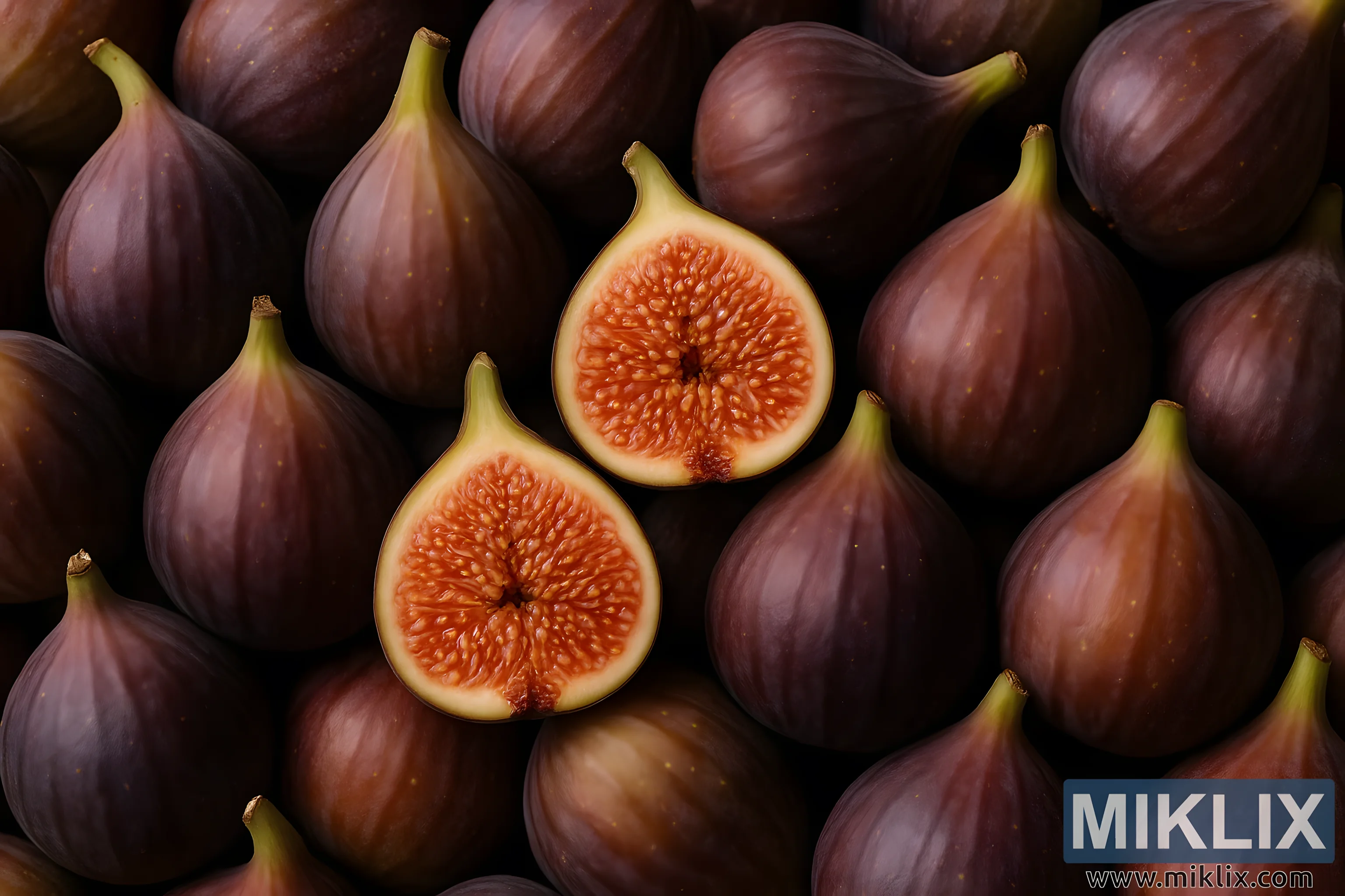 This high-resolution landscape photograph captures a rich, organic composition of ripe Brown Turkey figs, artfully arranged to emphasize their natural colors and textures. The frame is filled edge to edge with plump figs in various stages of ripeness, ranging from deep violet-brown to warm purplish-green tones, each fruit displaying the subtle sheen and striations characteristic of this variety. At the center of the composition, two figs have been sliced cleanly in half, revealing the mesmerizing interior — a vibrant red-orange matrix of fibrous flesh studded with countless tiny golden seeds. The contrast between the matte, dusky skin and the glossy, jewel-like core creates a striking visual tension that draws the viewer’s eye immediately toward the cut figs.