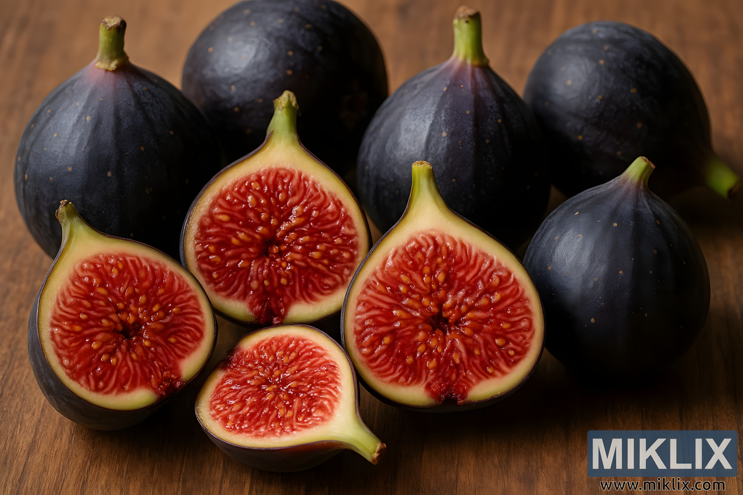 This high-resolution landscape photograph captures a close-up view of ripe Chicago Hardy figs arranged on a rustic wooden surface. The composition focuses on both whole and halved figs, allowing their contrasting textures and colors to stand out vividly. The figs’ exteriors display a deep, matte purple hue with subtle green undertones near the stem and delicate speckling across their smooth yet slightly dimpled skins. In contrast, the interiors of the halved figs reveal a striking burst of color — a radiant red flesh filled with densely packed, golden seeds glistening with natural moisture. The fibrous patterns within the fruit create a mesmerizing organic symmetry, drawing the viewer’s eye toward the core of each fig, where the textures converge in a rich tapestry of fine detail.