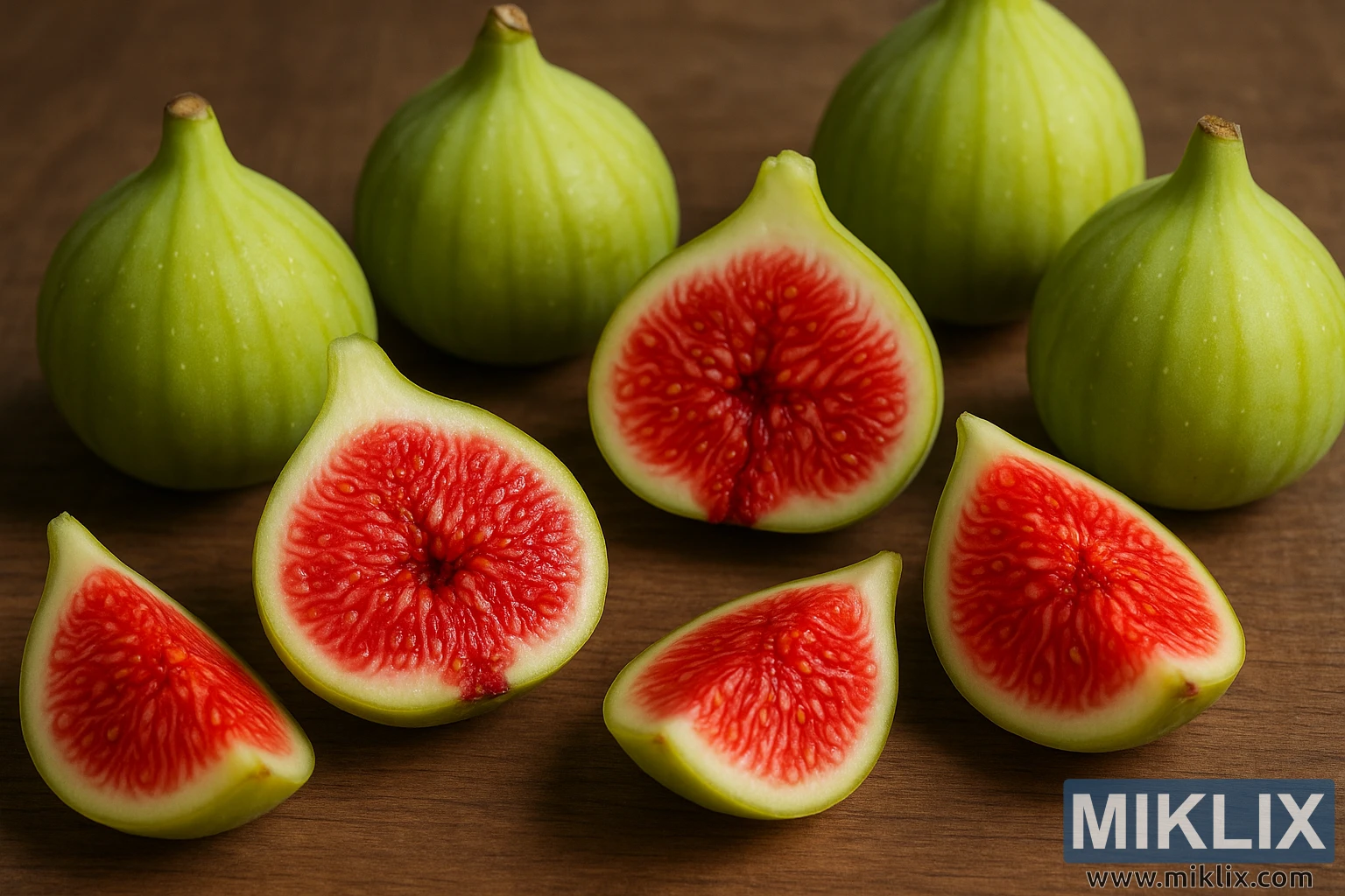 Overall, the photograph captures the Adriatic fig at its peak ripeness, celebrating the harmony of its colors and textures. The scene evokes freshness, Mediterranean warmth, and the quiet elegance of seasonal produce at rest. Each fig, with its light green skin and vivid red core, appears almost jewel-like—an exquisite study in contrast, vitality, and the simple beauty of nature’s design.