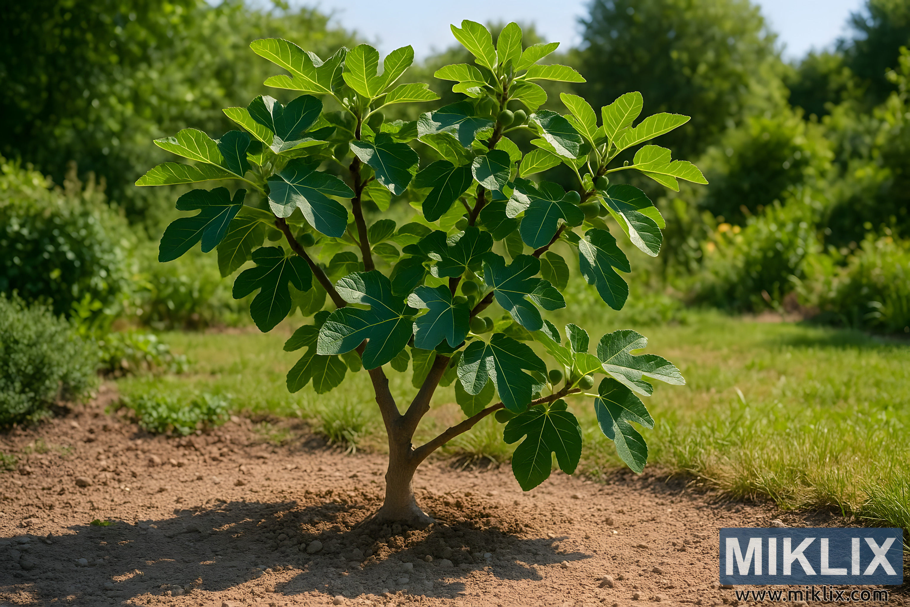 A vibrant fig tree (Ficus carica) thriving in a sunny, well-drained garden. The healthy plant stands in fertile soil surrounded by greenery, bathed in warm sunlight.