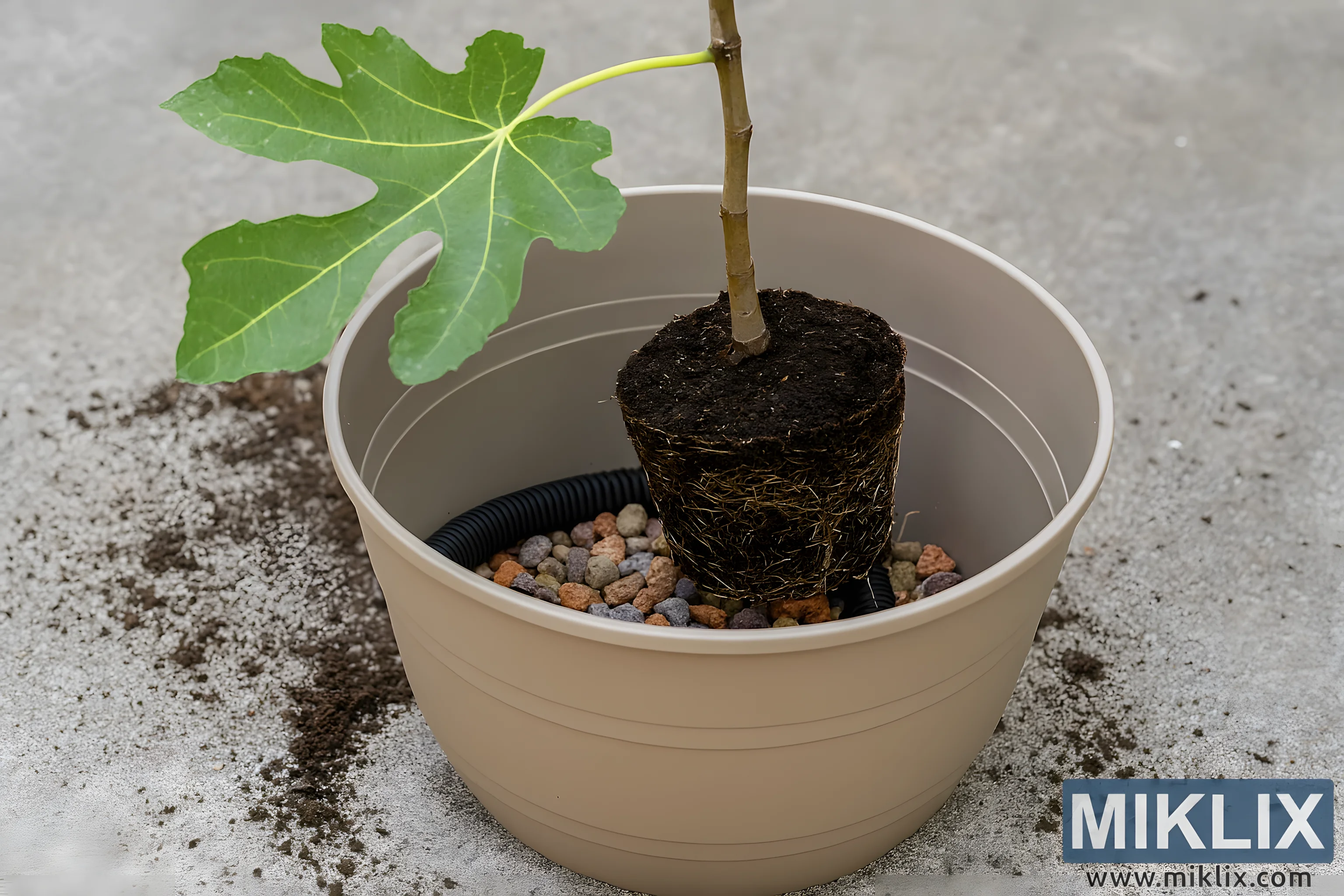 The fig tree, with its vibrant green leaves and deeply lobed structure, is held upright by a gardener whose hands are gently guiding the root ball into the soil. The root ball is dense and dark, interwoven with healthy roots and coated in moist, nutrient-rich soil. Beneath the root ball, a layer of gravel and multicolored drainage stones—ranging from soft pinks and oranges to muted grays—lines the bottom of the container. These stones serve as a critical drainage layer, allowing water to flow freely and air to circulate around the roots.