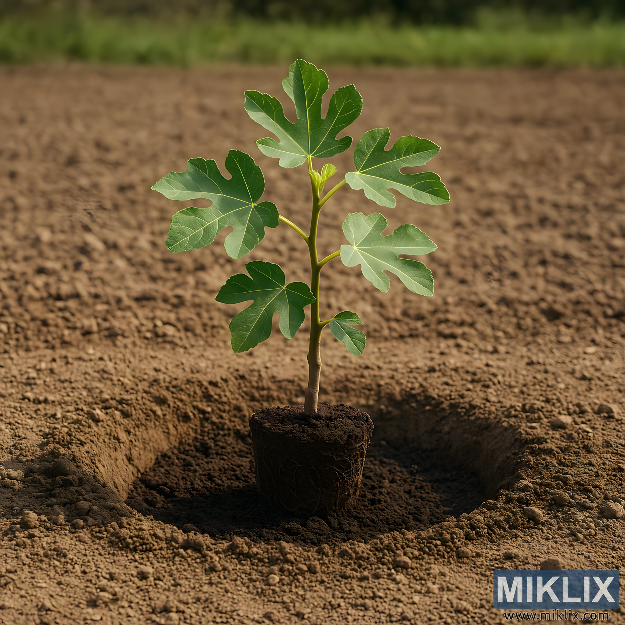 A young fig tree with vibrant green leaves is freshly planted in a well-prepared hole, showing proper spacing and soil preparation for healthy growth in a rural garden setting.