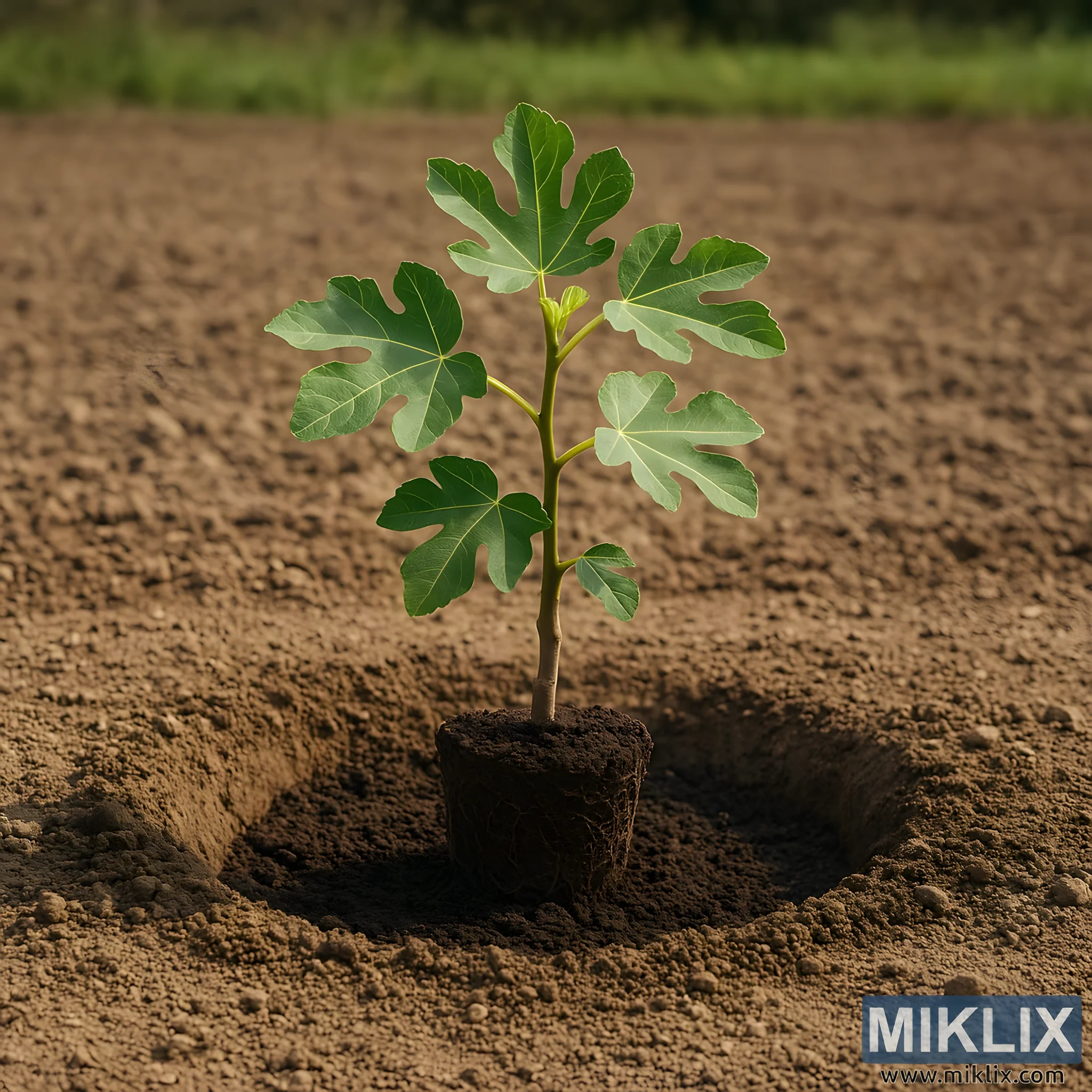 This image effectively communicates agricultural care, environmental stewardship, and the early stages of plant cultivation. It represents not just the act of planting but also the foundational steps of sustainable horticulture—proper spacing, soil preparation, and careful handling of young roots. The fig tree, long associated with longevity, nourishment, and natural abundance, adds symbolic depth to the photograph. Its presence in this earthy, open landscape captures both the practical and poetic aspects of growing something new from the ground. The image would be suitable for educational, agricultural, or environmental contexts, illustrating topics such as tree planting, organic farming, soil management, or sustainable gardening practices.