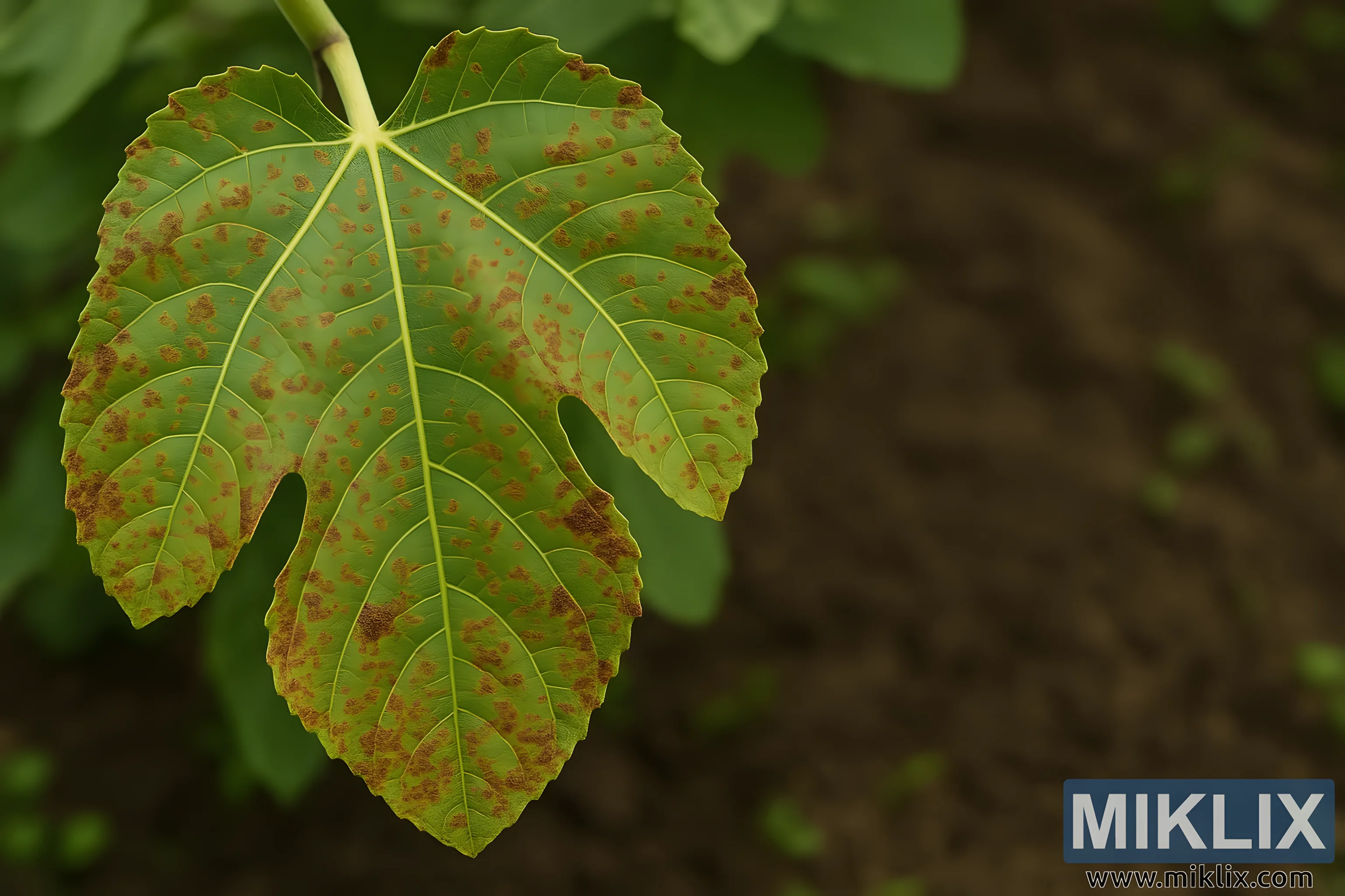 This high-resolution, landscape-oriented photograph captures a single fig leaf (Ficus carica) in vivid natural detail, illustrating the visible effects of fig rust disease (Cerotelium fici). The composition centers on the large, lobed leaf, which is sharply focused against a softly blurred background of soil and surrounding green foliage. The fig leaf fills most of the frame, suspended diagonally from the upper left, its stem emerging from the top margin and leading the viewer’s eye into the main subject. The intricate venation of the leaf is clearly visible — a network of prominent yellow-green veins that radiate outward from the central stem, dividing the surface into distinct sections.