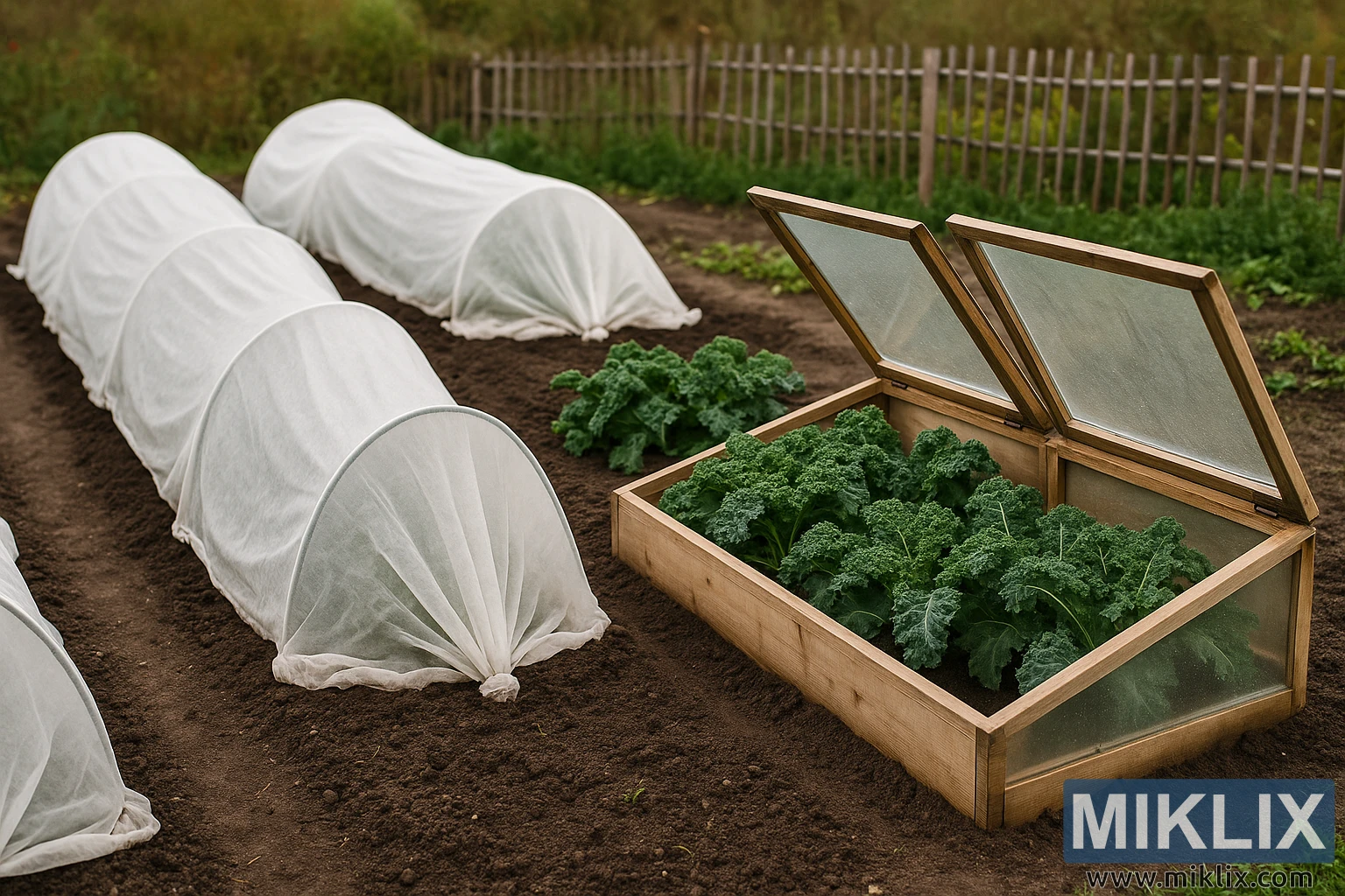Every element of the image emphasizes practical, sustainable horticulture. The tools and methods shown—row covers and cold frames—highlight accessible, low-cost techniques for managing temperature and extending the growing period of cold-hardy crops like kale. The overall composition captures not only the functional side of these methods but also their quiet beauty: a well-ordered garden harmoniously integrated with its environment. Subtle details such as the texture of the soil, the wood grain of the cold frame, and the soft translucence of the covers contribute to the authenticity and tactile realism of the scene. It conveys both instructional and aesthetic value, perfectly illustrating how simple innovations can yield year-round harvests in a modest, well-tended garden.