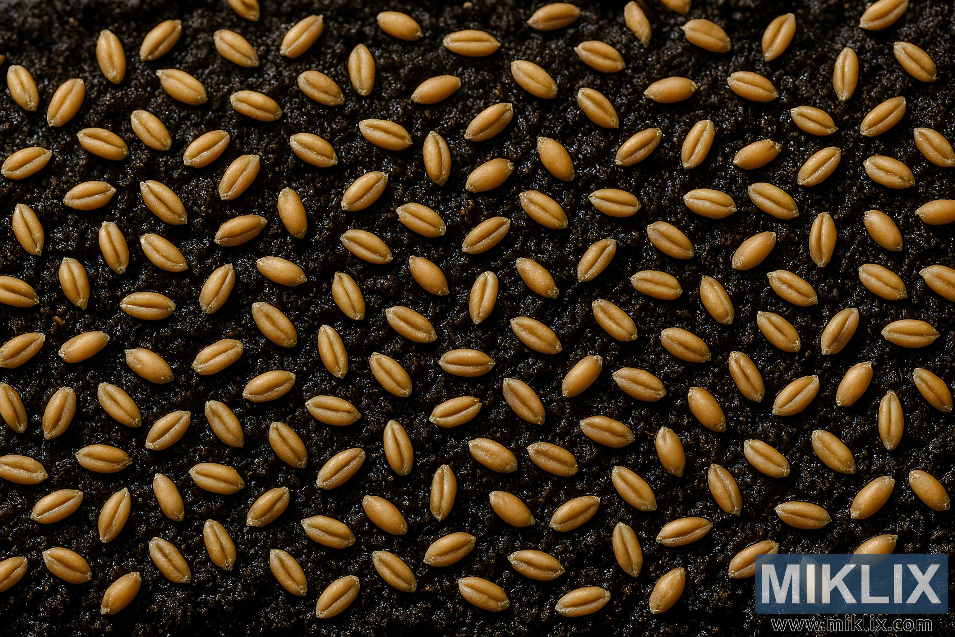 A detailed landscape image showing golden wheat seeds evenly distributed across rich, moistened soil. Ideal for agricultural, botanical, or educational use.