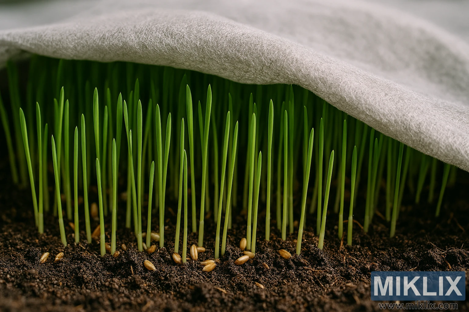 High-resolution landscape photo showing vibrant wheatgrass sprouts emerging from moist soil beneath a protective cover.