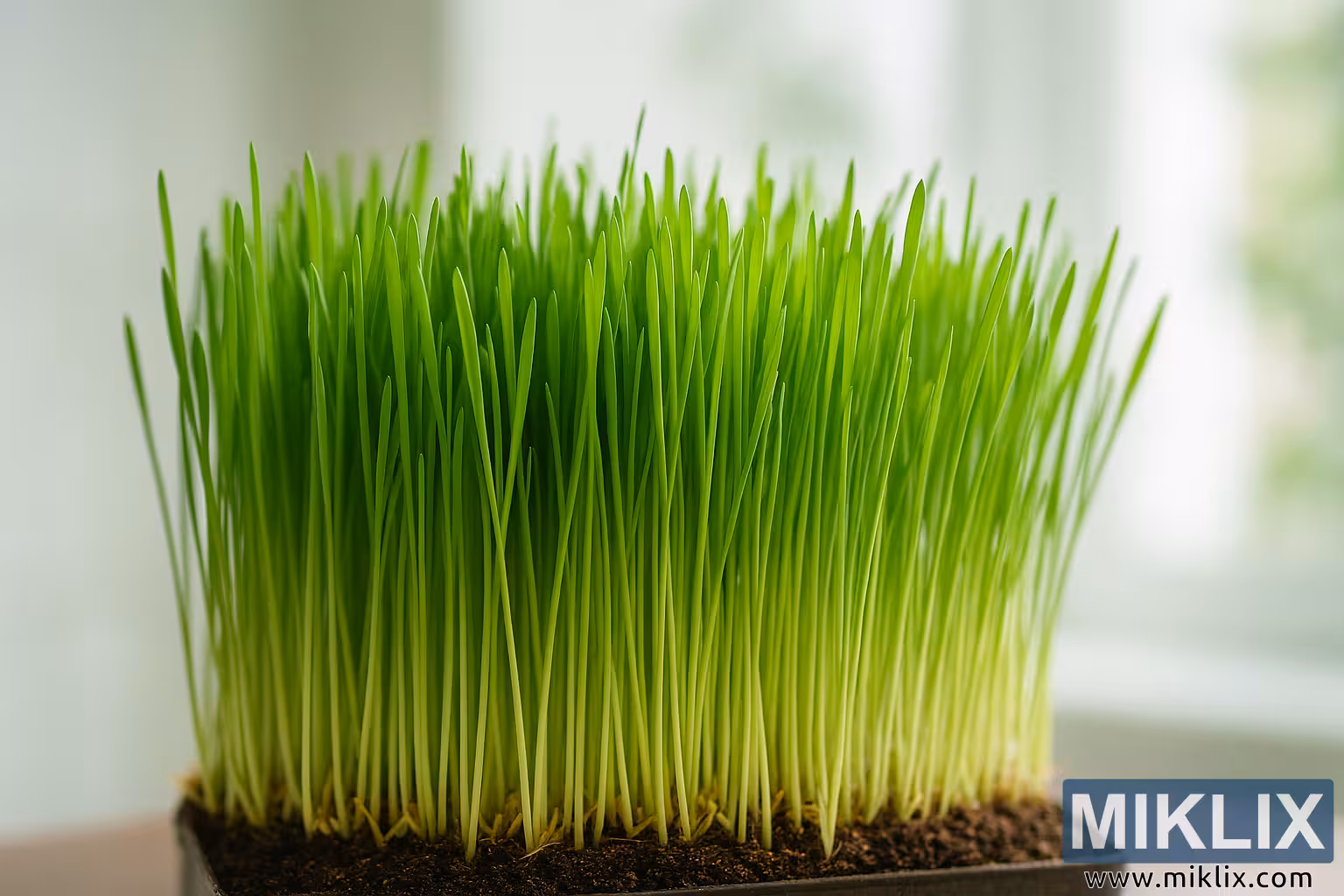High-resolution image of lush wheatgrass thriving in bright indirect light, ideal for wellness and gardening visuals.