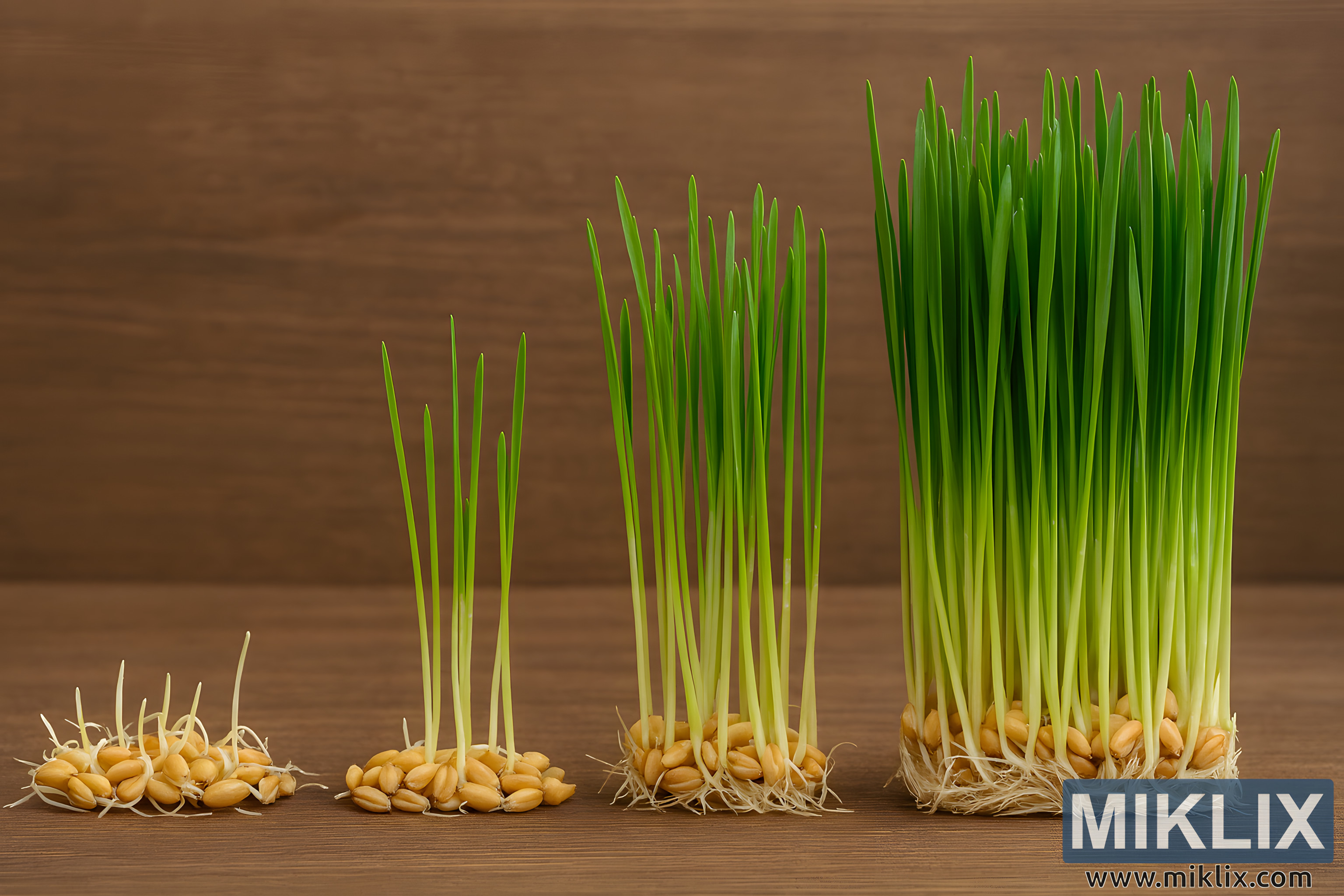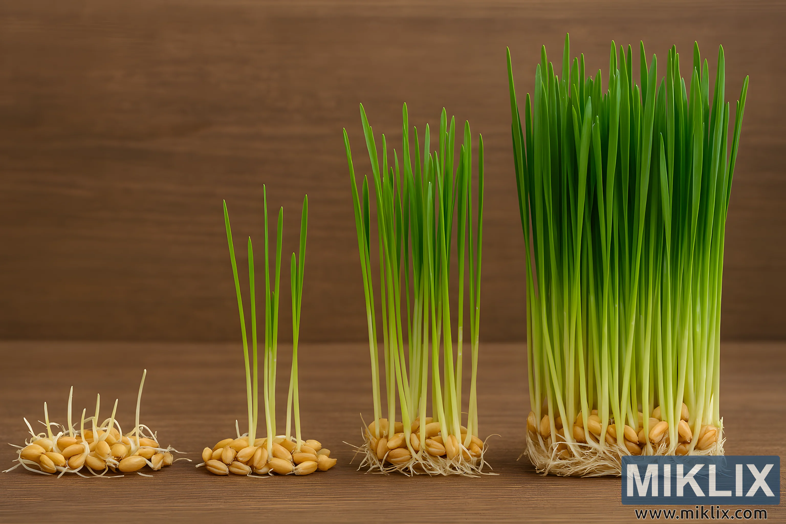 High-resolution landscape image showing four distinct stages of wheatgrass growth, from germination to full maturity, ideal for educational and botanical use.