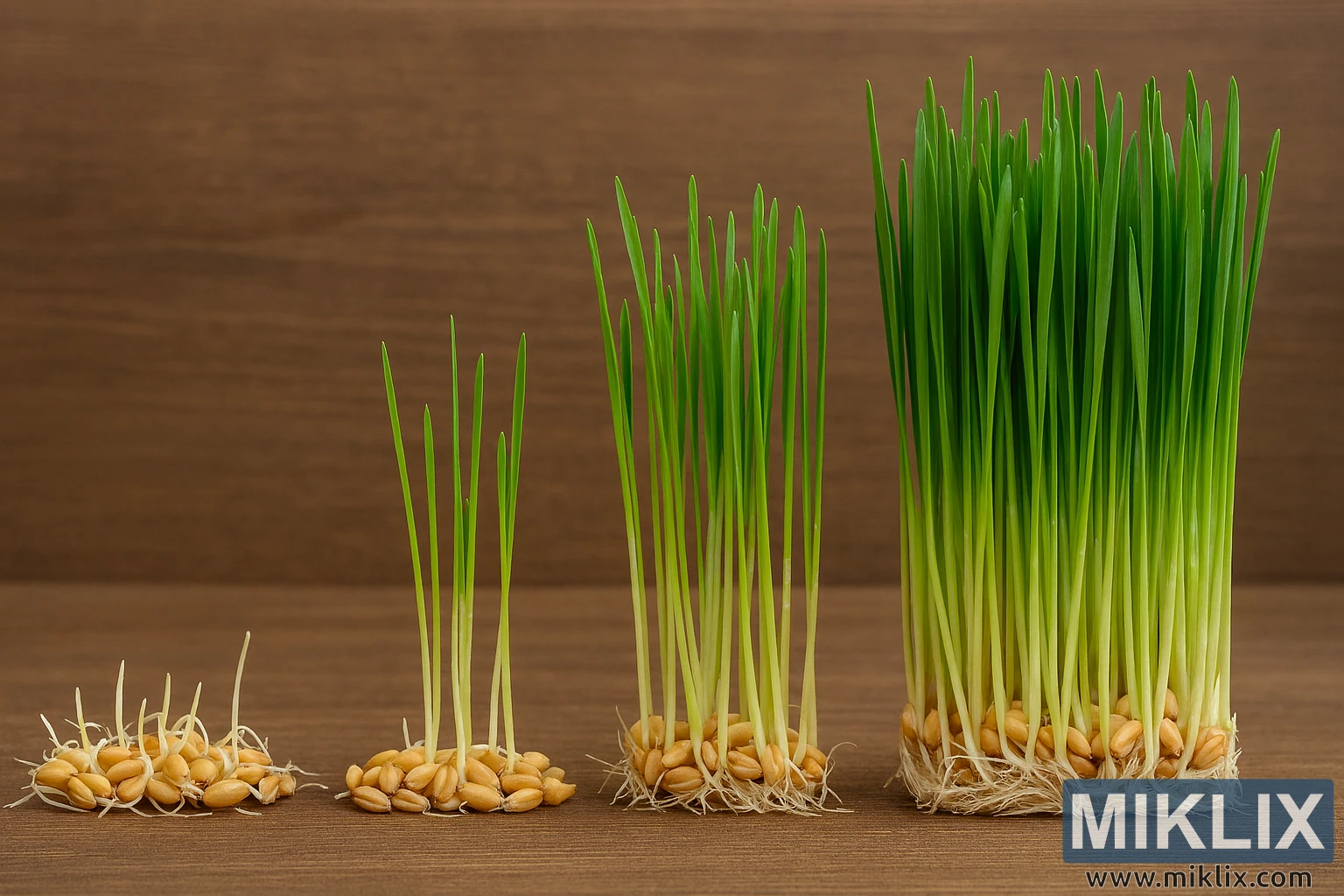 This image is ideal for educational, botanical, and promotional use, illustrating the lifecycle of wheatgrass with clarity and realism. It offers a visually compelling narrative of plant development, suitable for textbooks, gardening guides, health and nutrition content, or catalog displays.