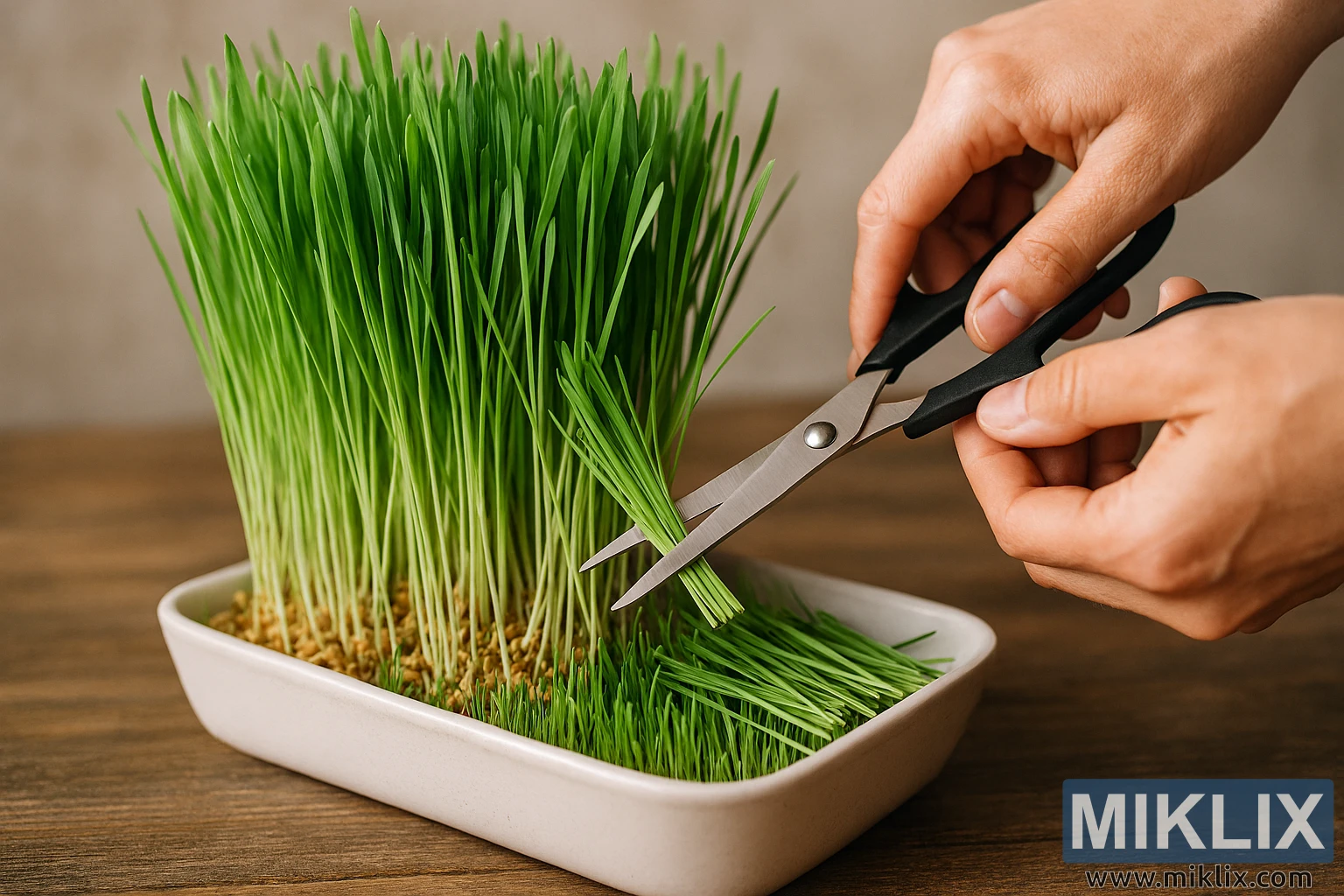 A detailed close-up photo of hands harvesting vibrant green wheatgrass with scissors from a ceramic tray, showcasing natural textures and earthy tones.