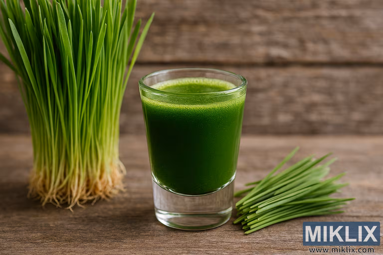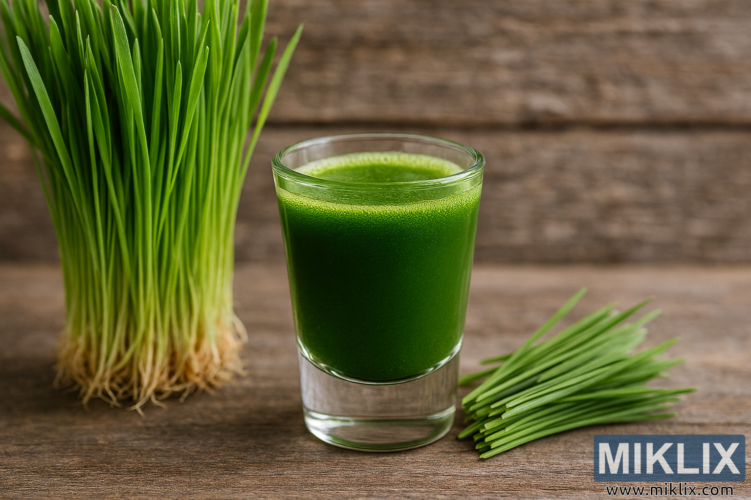 A high-resolution landscape photo of fresh wheatgrass juice in a clear shot glass, surrounded by vibrant wheatgrass blades on a rustic wooden surface.