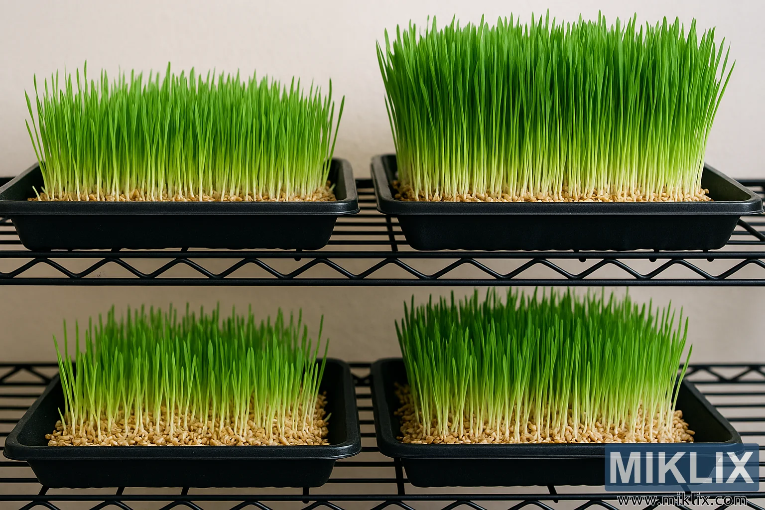 High-resolution image showing multiple trays of wheatgrass at varying growth stages, ideal for educational or agricultural use.